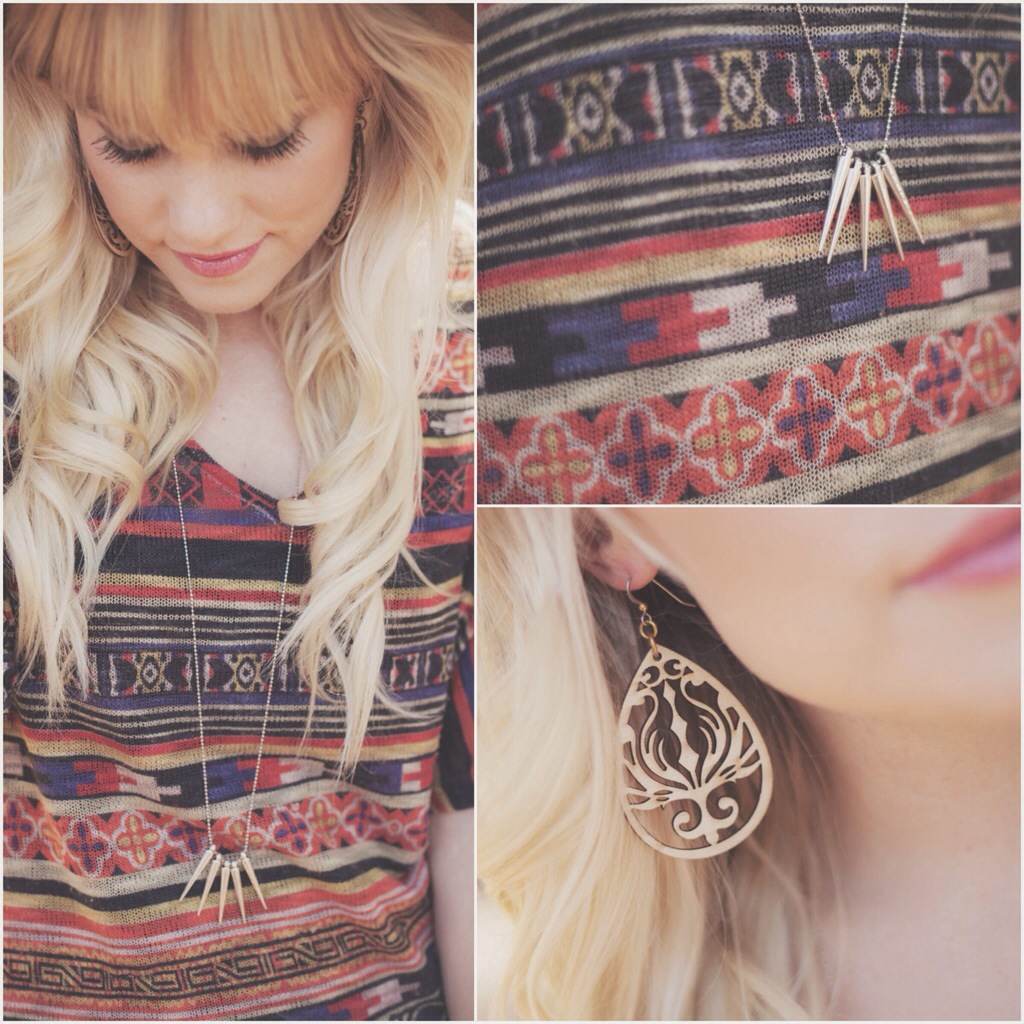 Displaying photo.JPG“The Dainty Spikes Necklace” is so cute! I love the simplicity of it but also how it has a fierce nature about it. Combining it with a native inspired top seemed like the perfect fit.