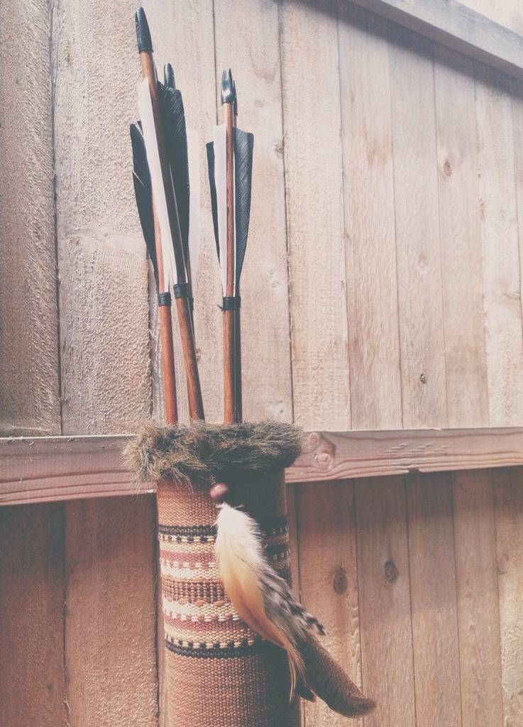 I made these quivers using a drain pipe cut into three parts. Each one was wrapped in a select fabric to tie in details from the bows. I stocked up on a bunch of feathers and faux fur and using a high quality craft glue, carefully placed each detail where I wanted it. These quivers have a hook tied through the back that hooks onto a belt loop, serving as the perfect side quiver. A strap can easily be attached and also serve as a shoulder quiver, or simply placed on the ground for a beautiful ground quiver. I am super happy with how they turned out! Which one is your fav?