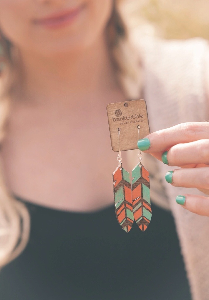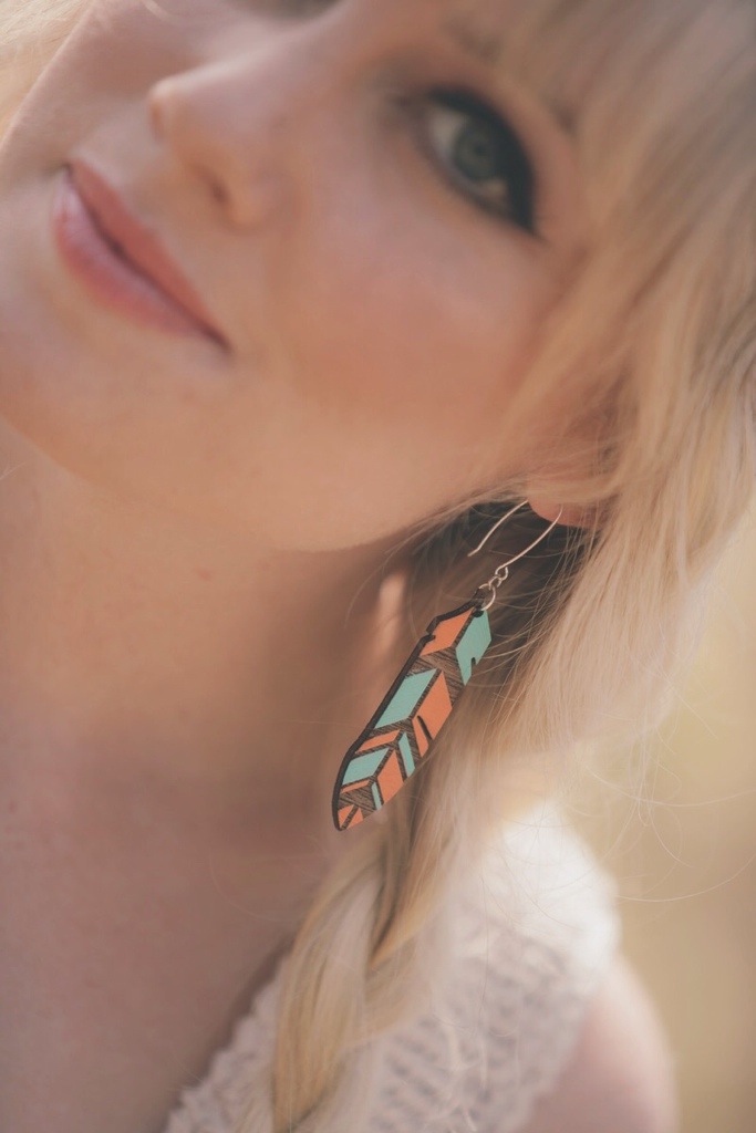 These wooden “Chevron Feather Earrings” were laser engraved and hand painted. I love the vibrant color choice and the detail!
