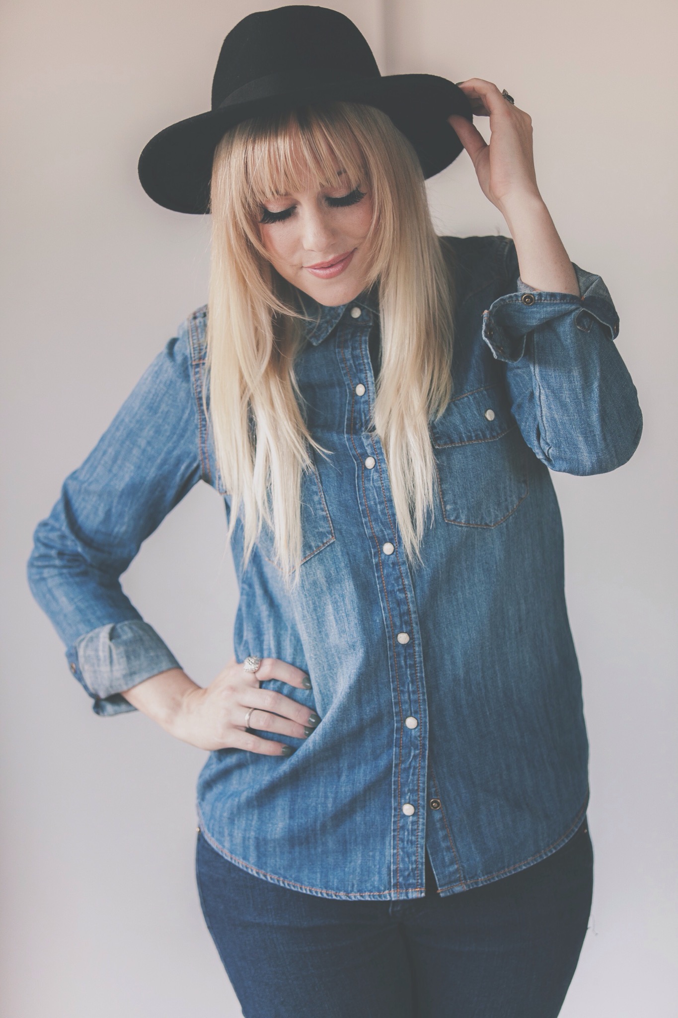 I am loving denim on denim this fall! It’s such a simple and casual look, but unique at the same time. This denim shirt was $25 at Forever 21 and the quality of it is great! There are so many different ways to wear it, but I decided to style it with my sleeves rolled and buttoned all the way to the top. I wanted my denim shirt to be slightly lighter than my jeans, so I chose to pair them with my favorite jeans from Forever 21, then tucked them into my thrifted boots with Burgundy laces. To top off the look I added my black hat from H&M. You will probably catch me wearing this look a lot this fall and winter π Have a beautiful day everyone! PS-My dog Taza says hello!