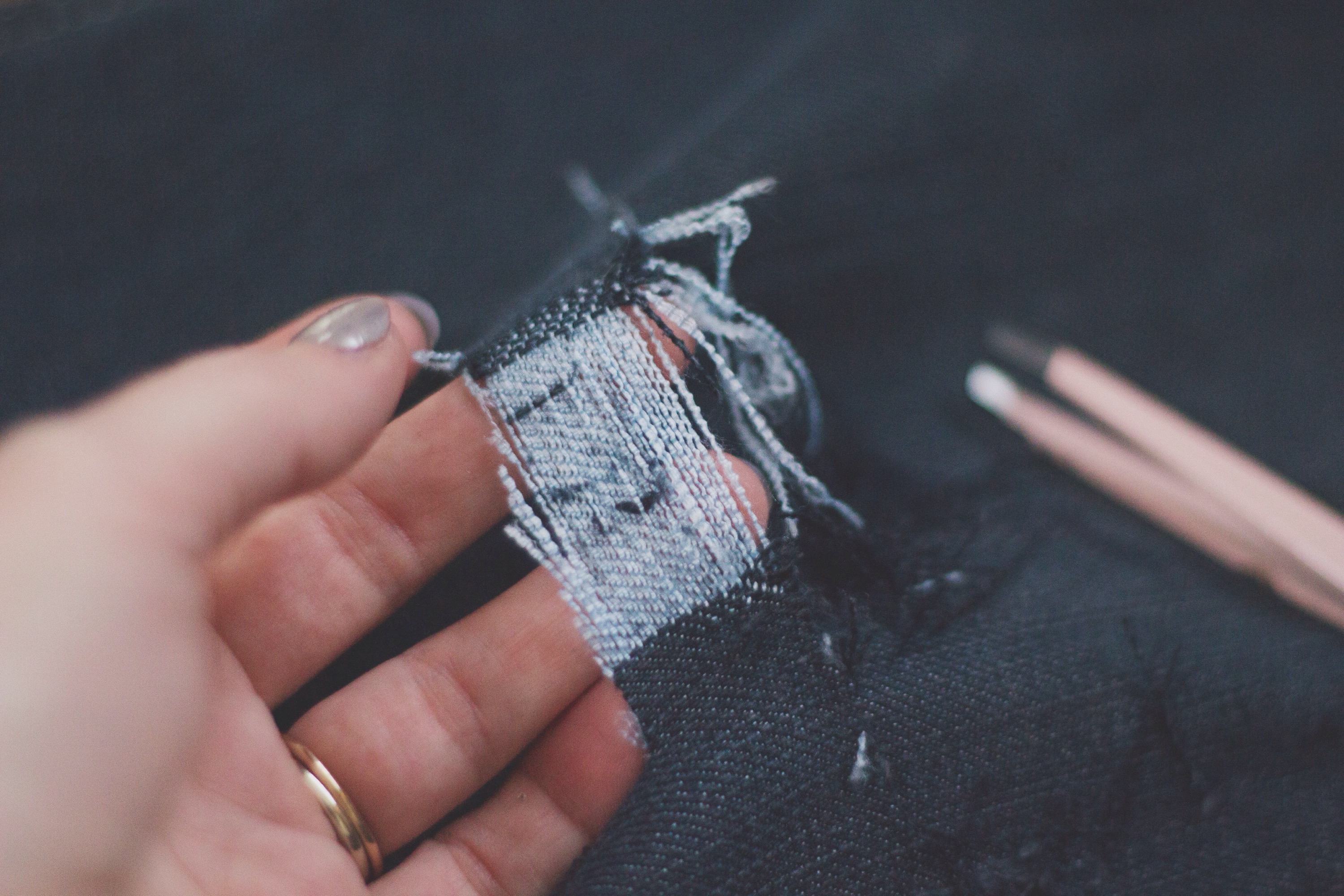 After cutting your slits, grab your tweezers and start pulling out the vertical threads, the first couple are a little hard to pull out, but once you start, it gets easier to pull out the rest. I like using this technique because I prefer the look of holes with the white (horizontal) threads still showing. It looks a little more like authentic wear and tear.