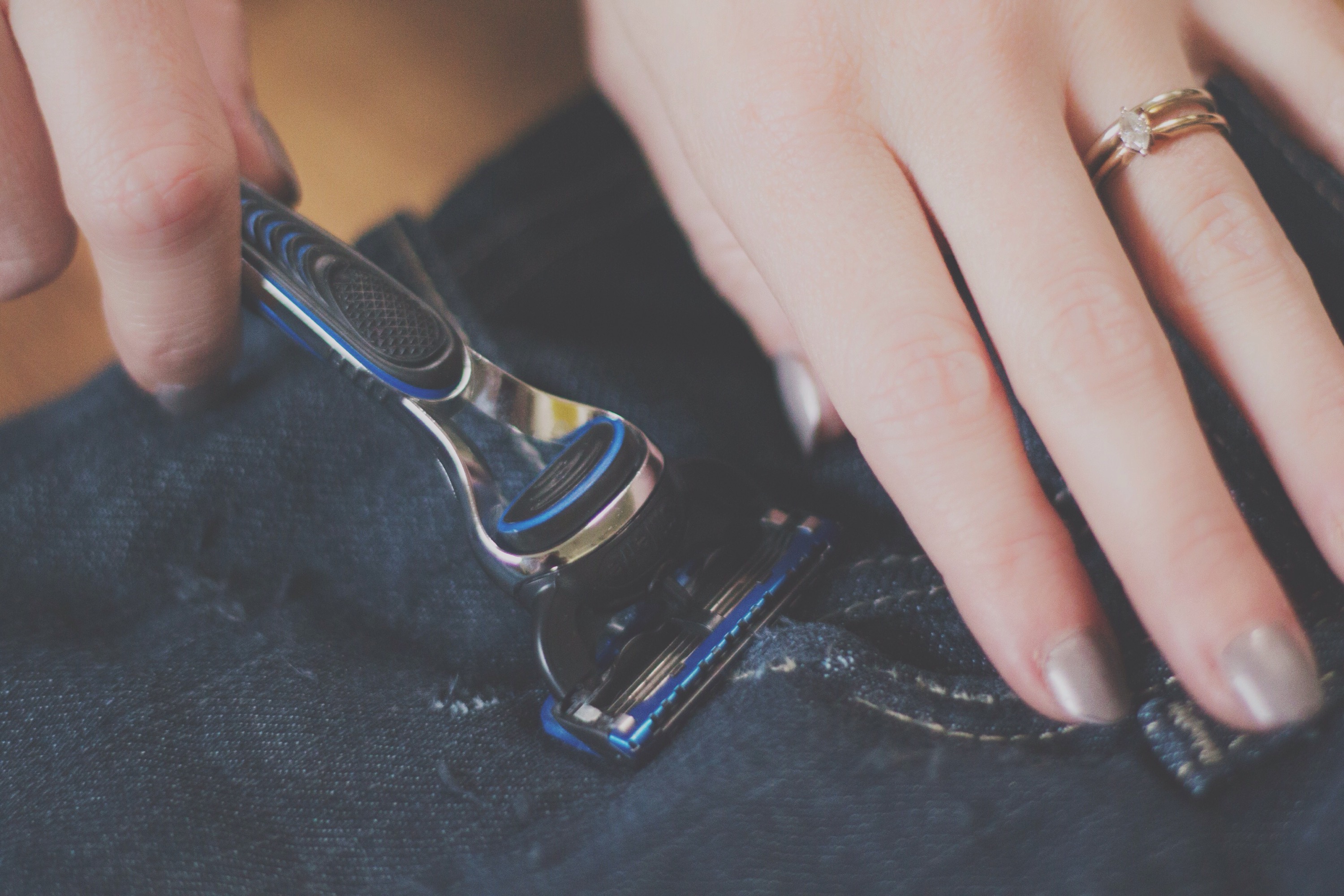 Another tool you can use to add more distressing is a razor. I like using this tool around the pockets and the edges of jeans to create small holes and to rough them up a bit more. After you are done with all the distressing, then throw your jeans in the wash in warm water, then dry them on the high setting. This will add a little more fraying and make the holes look more worn.