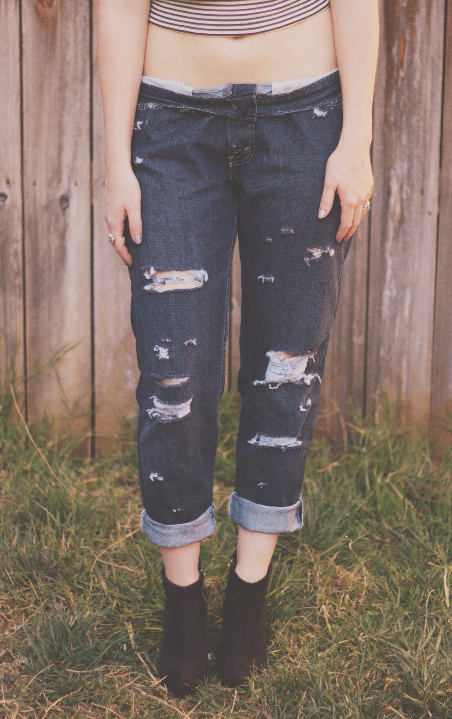 I’ve been really into distressed denim lately and thought I would share with you all a step by step on how to create your own unique distressed denim. There are several different techniques that you can use, this is just one easy way how to DO IT YOURSELF! You can go as subtle as you want, (just on the knees) or a little more dramatic, whatever you prefer. In this post, I will be showing the steps I used to create my boyfriend jeans in the picture above on the right.