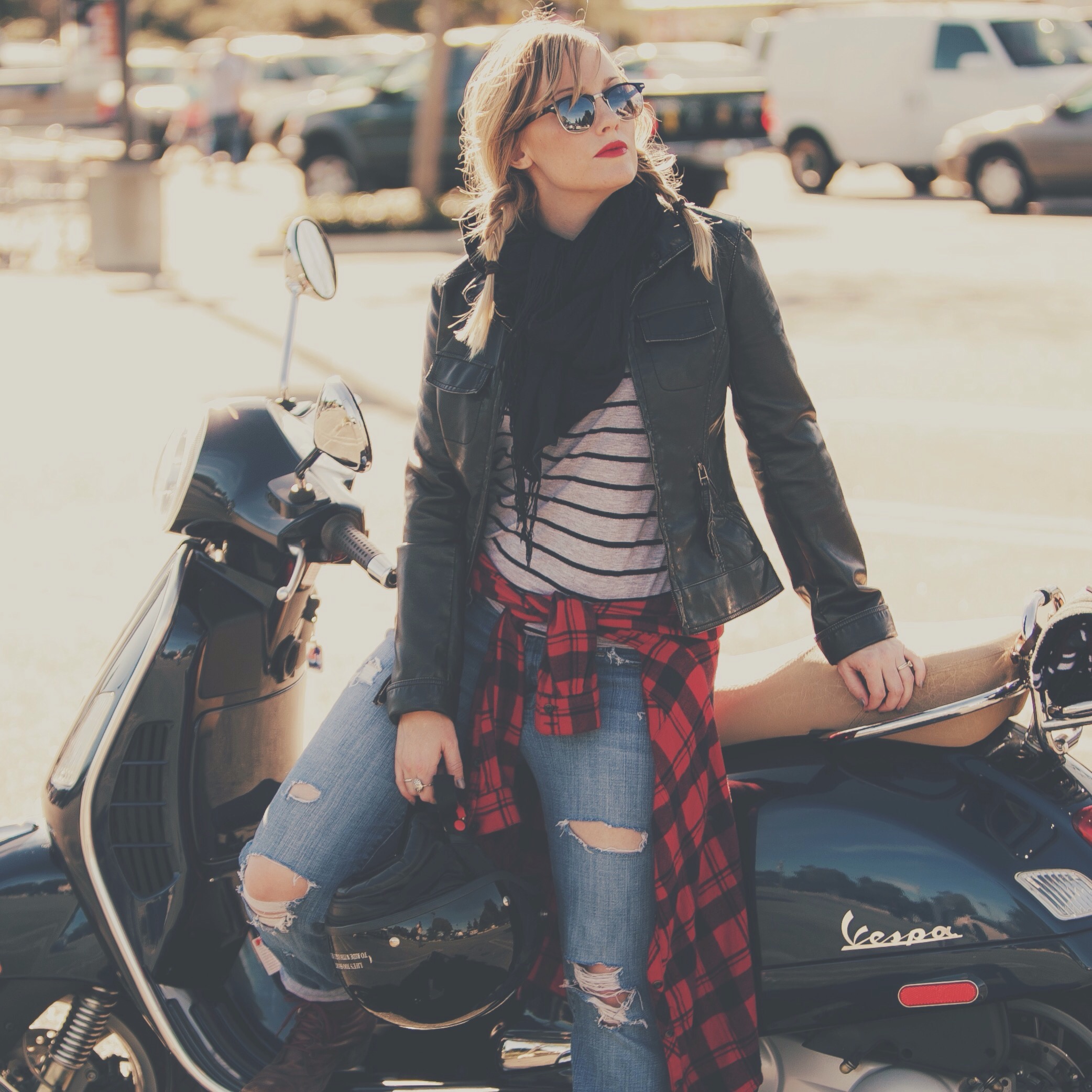 Winter is slowly coming to an end which means I get to start riding my Vespa more! There’s been some beautiful sunny days lately and I love taking advantage of them. Since I take my scooter to and from work, and sometimes take it on the highway it can still be pretty windy and slightly chilly. I like wearing my black faux leather jacket with a flannel underneath and it’s usually just warm enough. I did some more distressing to another pair of boyfriend jeans, (see previous posts for a DIY on distressing denim) and love how they turned out. I’m styling them with my brown thrifted boots, striped t-shirt, and flannel from Forever 21. The native style blanket strapped to the back of my Vespa is also from Forever 21 🙂 Living on the Central Coast is truly a blessing and I’m stoked I have a scooter to add to the excitement!