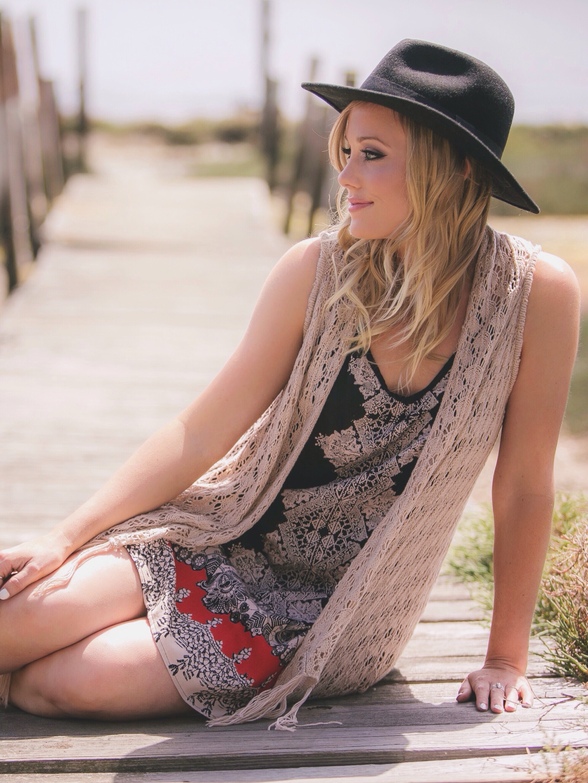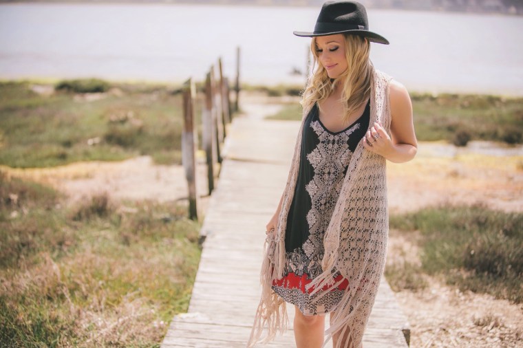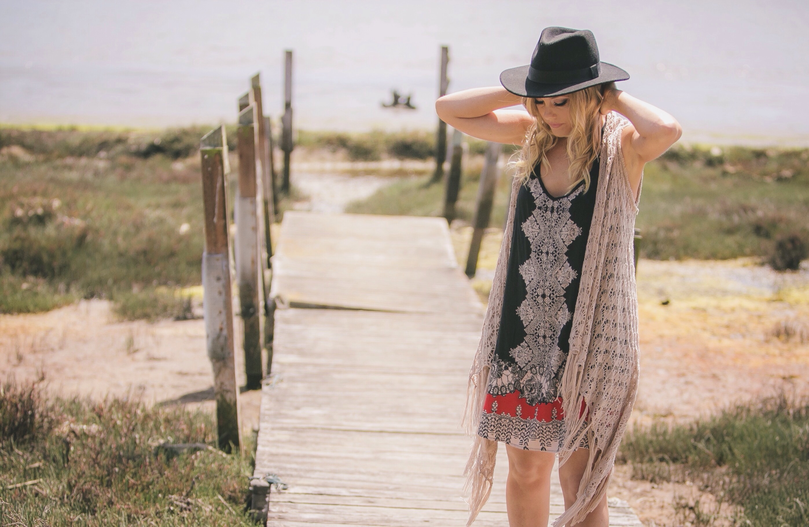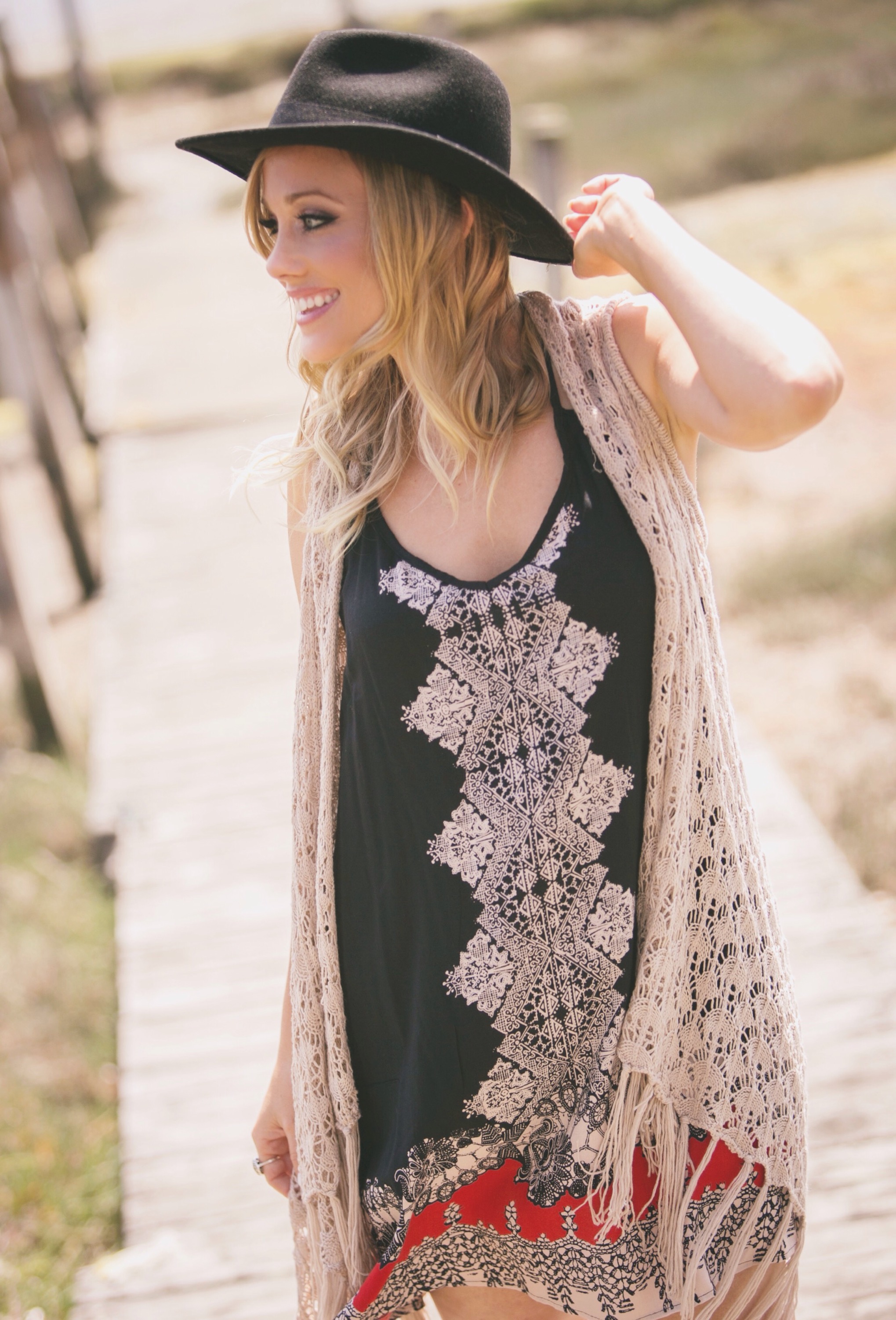 My husband picked out this beautiful dress from Tillys for me as a Christmas present last year. He wanted to get me things that I could wear for Spring and Summer instead of wintery items I could only wear once a year. I LOVE it when my husband shops for me! He has such amazing taste and such a great eye for cute and stylish clothes. I love the pattern, the loose fit, and the style of the dress, especially the back detail. I styled my dress with my crocheted fringed vest which is also from Tillys, and my go-to black hat from H&M. I’ll probably be wearing this dress a lot this summer! So perfect to throw over a bikini and head straight to the beach!