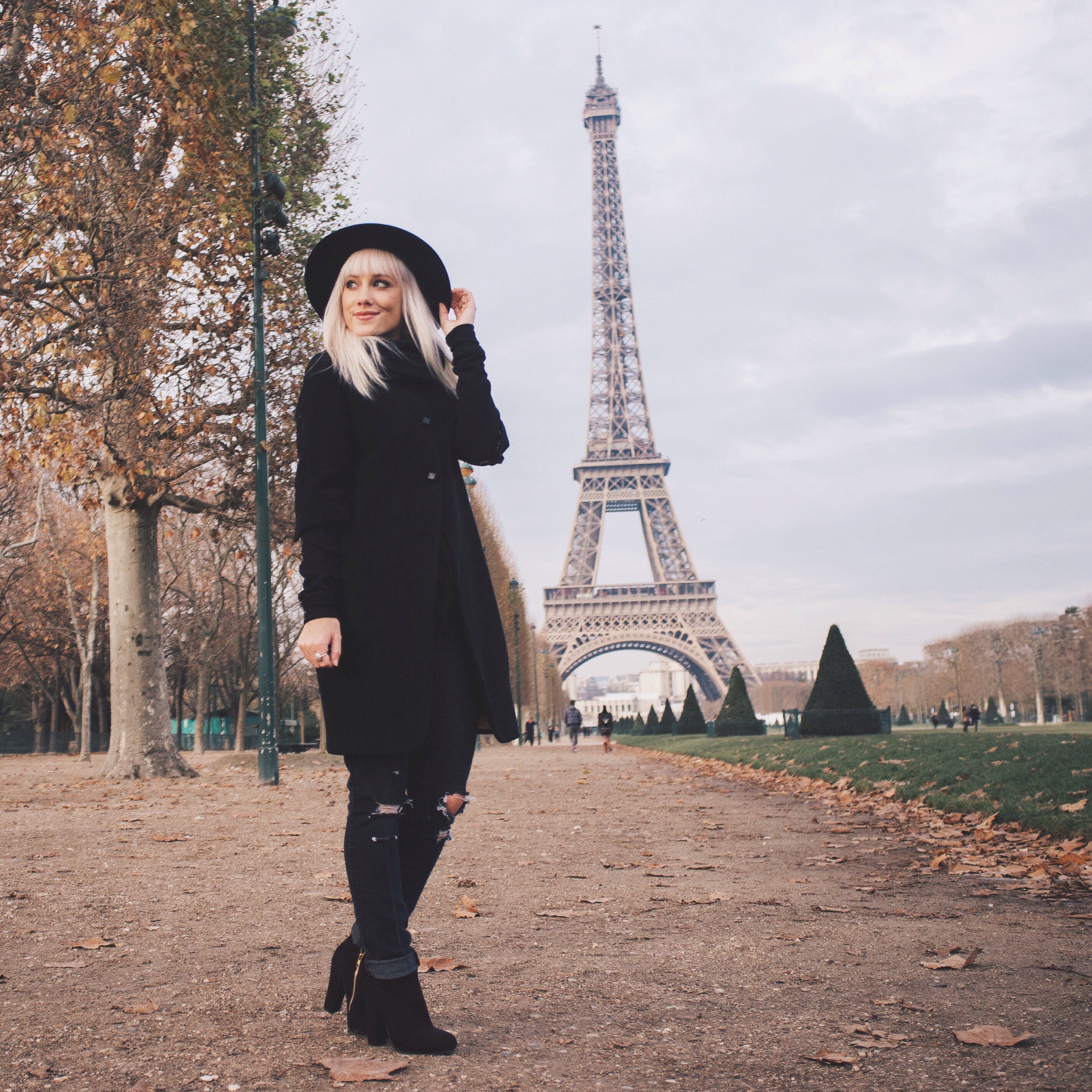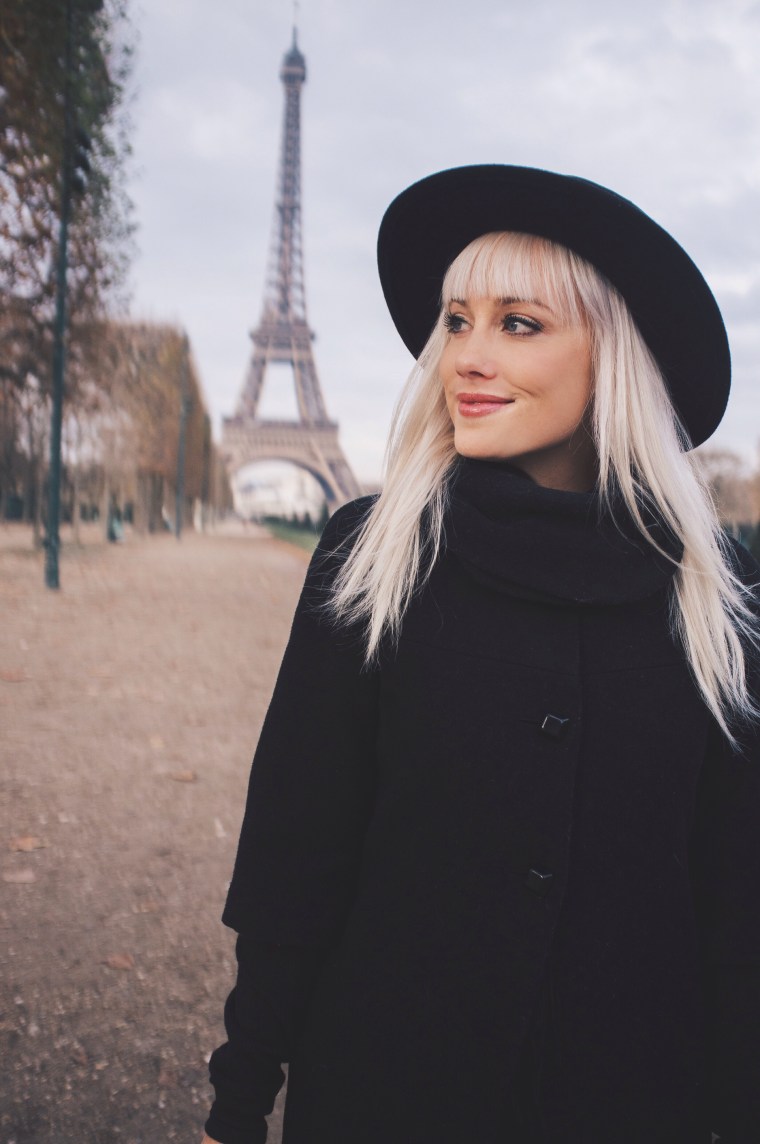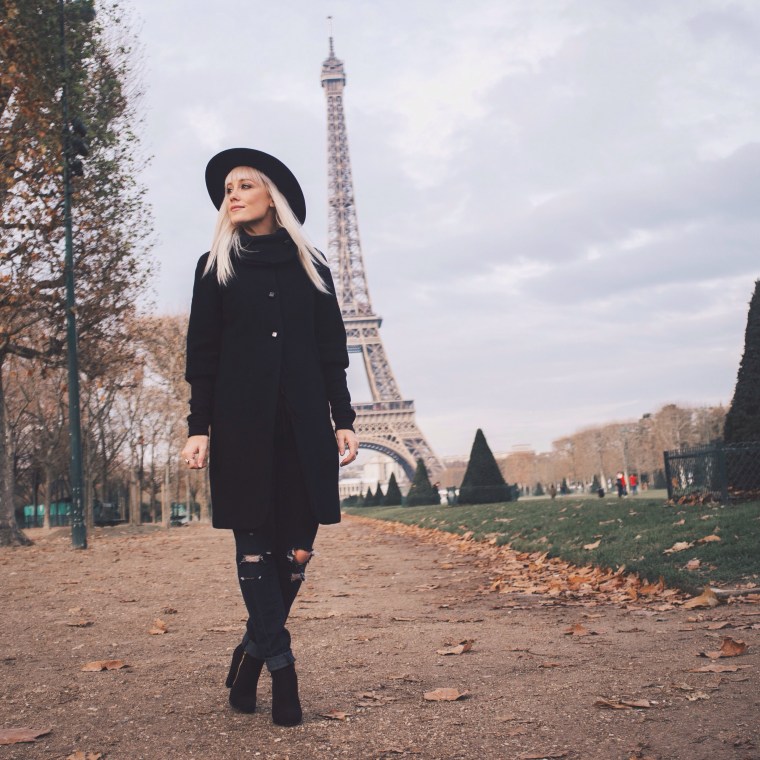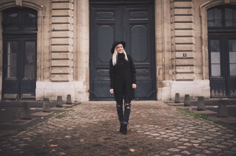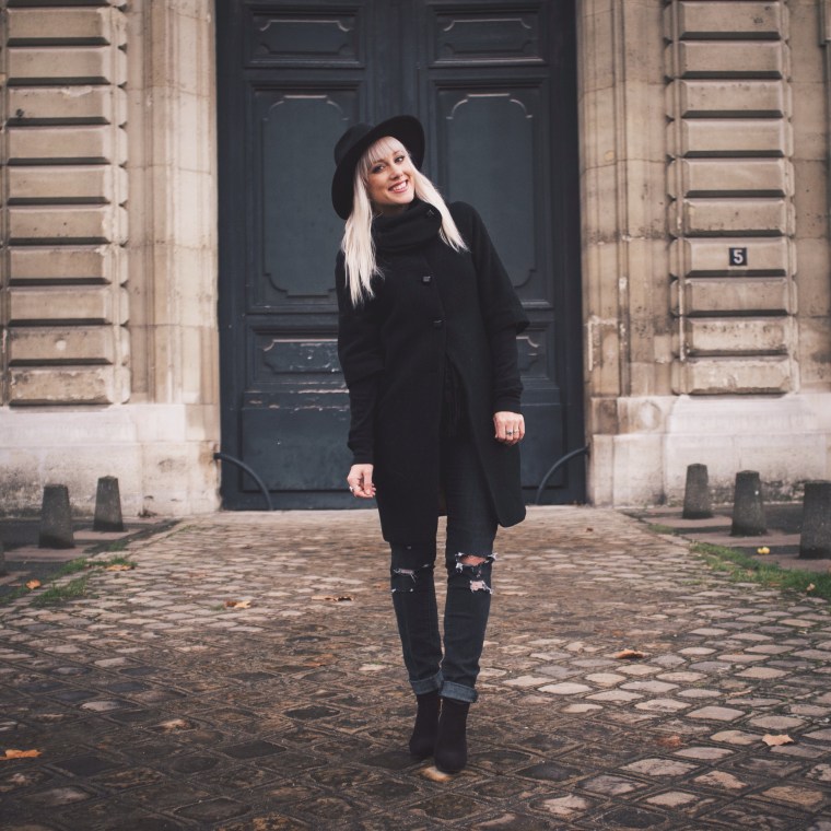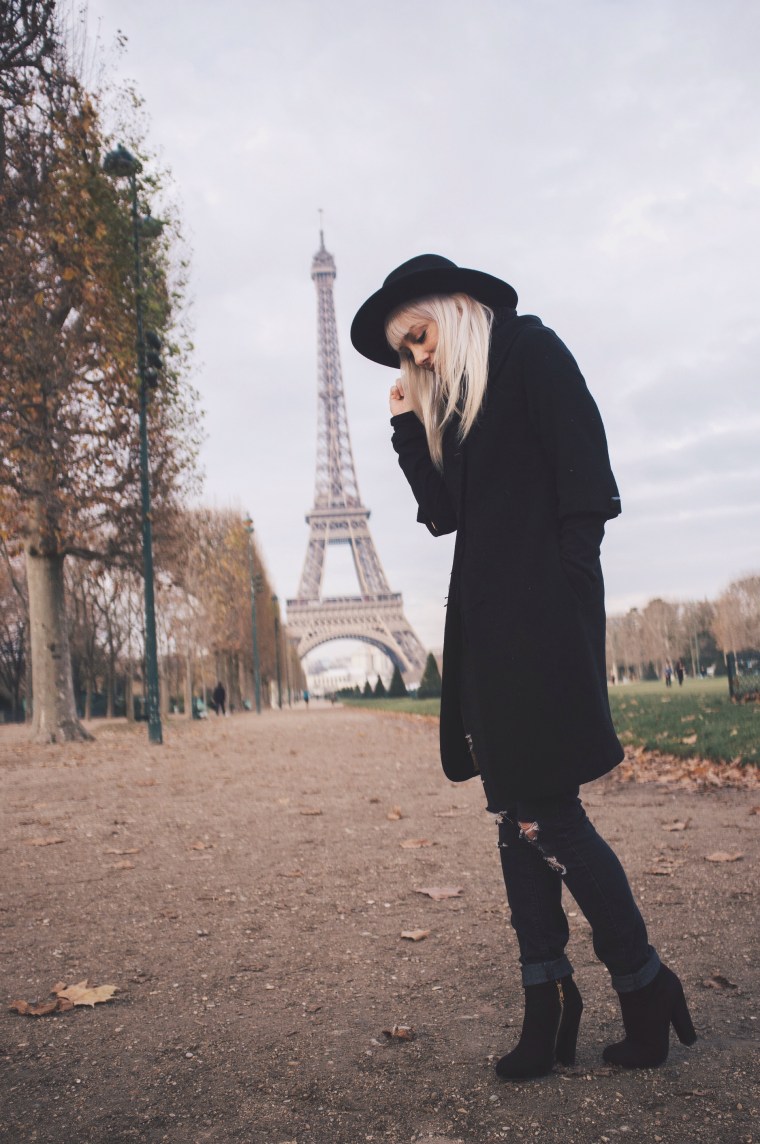 Being able to go back to Paris was such a joy! Dan and I took a trip to France last month and got to re-visit all the places we did 8 years ago. It’s still just as beautiful, just as captivating, and just as romantic.  We visited other cities in France but we spent the most time in Paris. We were gone a total of 15 days, so we really got to enjoy everything and take our time everywhere we went.  Our favorite place in Paris is still the Rue Cler, a charming market street near the Eiffel Tower. It was of course, extremely chilly while we were there, so underneath my three-quarter length wool coat that Dan gave me several years ago for Christmas, I wore two long sleeved thermals and a warm black scarf. I love all the cute button details on the back of the coat, the sleeves, and on the scarf-like collar of the coat. For this outfit I wanted to feel really Parisienne 😉 so I decided to go all black and wear my thrifted boots, old ripped Forever 21 jeans, and old hat from H&M.  I hope everyone is having a great start to the new year! 2016 is going to be pretty incredible and I’m so excited!