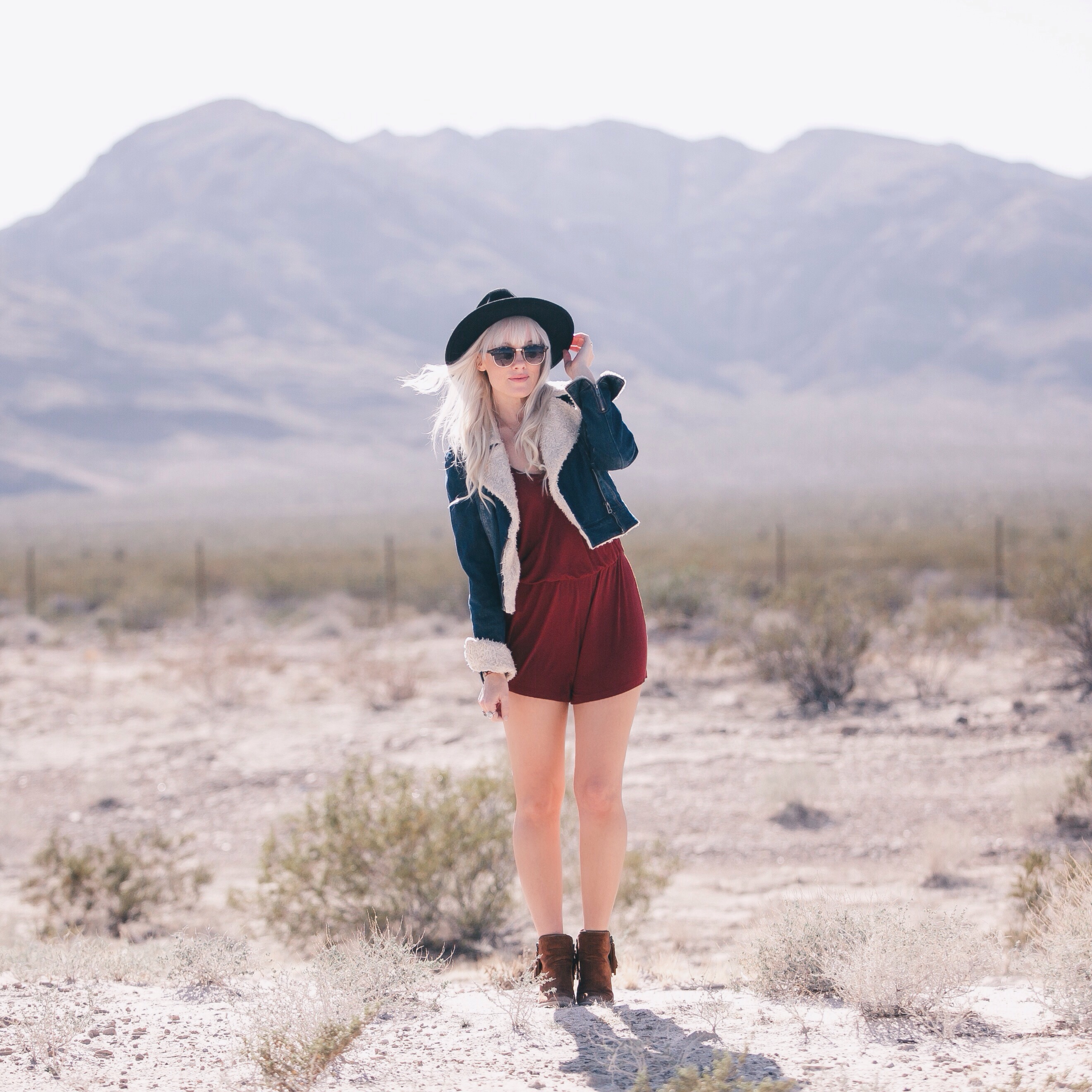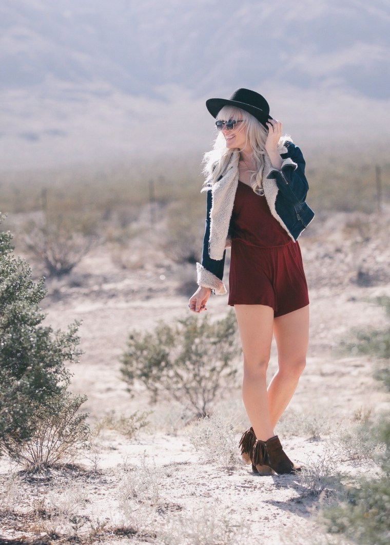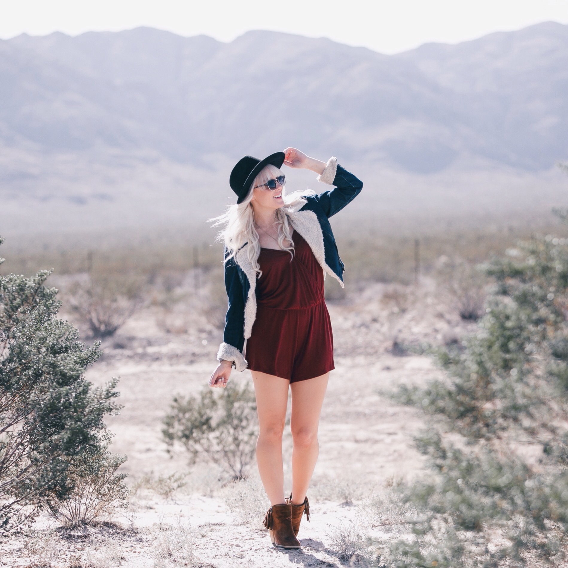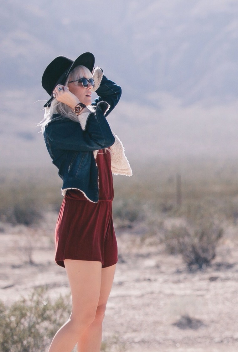 Our trip to the desert in our new trailer was such an adventure! I love living on the coast but sometimes it’s nice to have a change of environment. Today’s fashion post is featuring pieces I’ve had in my closet for some time now, but I’ve been disciplining myself to use the clothes I have and not fill my closet up with more fabric that a lot of times ends up just sitting there. It’s been hard but it’s also been fun seeing what lost pieces I can put together to make an outfit. My hat, romper, jacket and glasses are all from Forever 21. My crystal necklace is made by Tiana with Pueblo Street Jewelry Co, my native bracelet is made by me at Kari Jane Co, and my fringe boots are from Not Rated Footwear. If you find some shoes you like there, you can use code “Kari Jane” to receive 20% off your purchase. I hope everyone had a fabulous Easter with your families!
