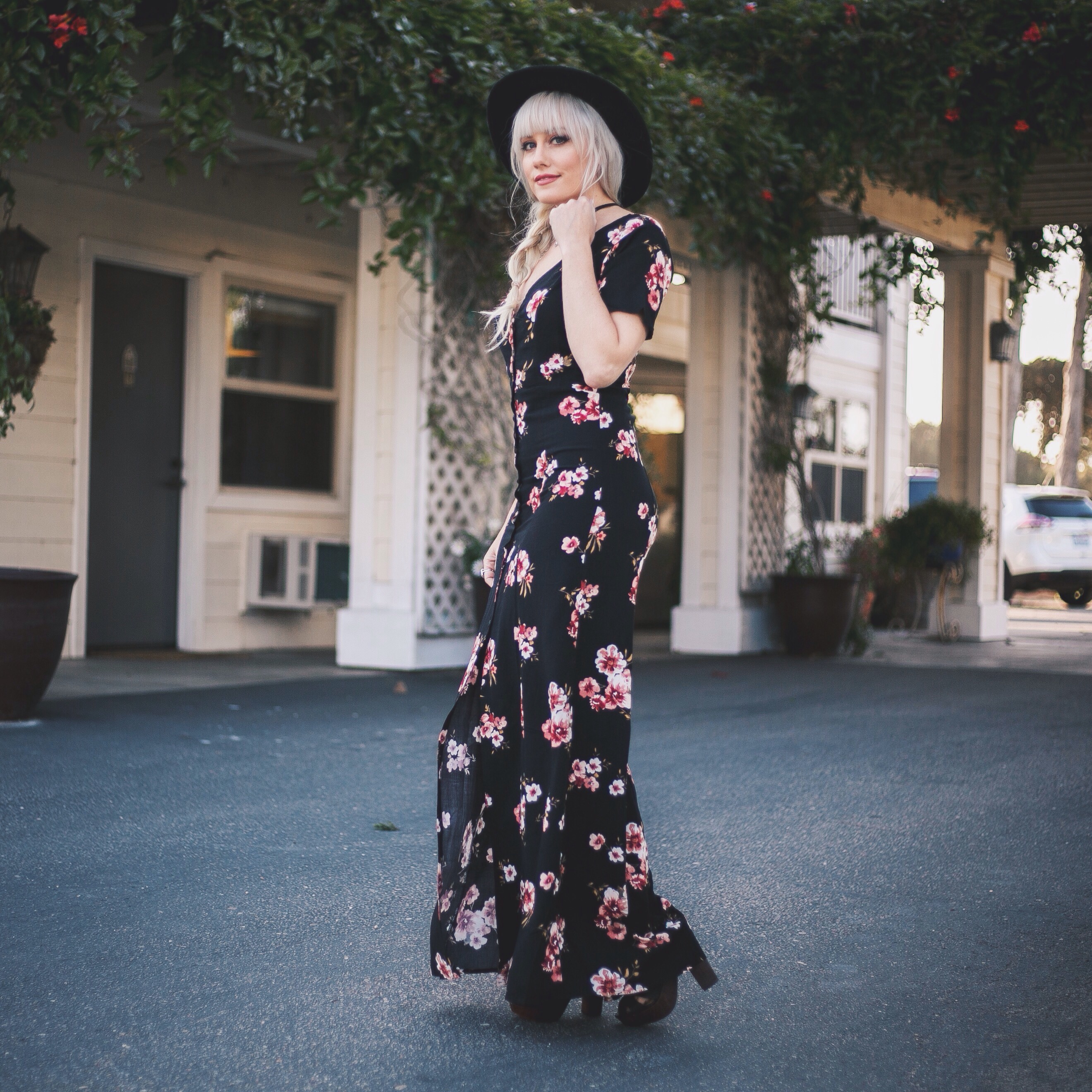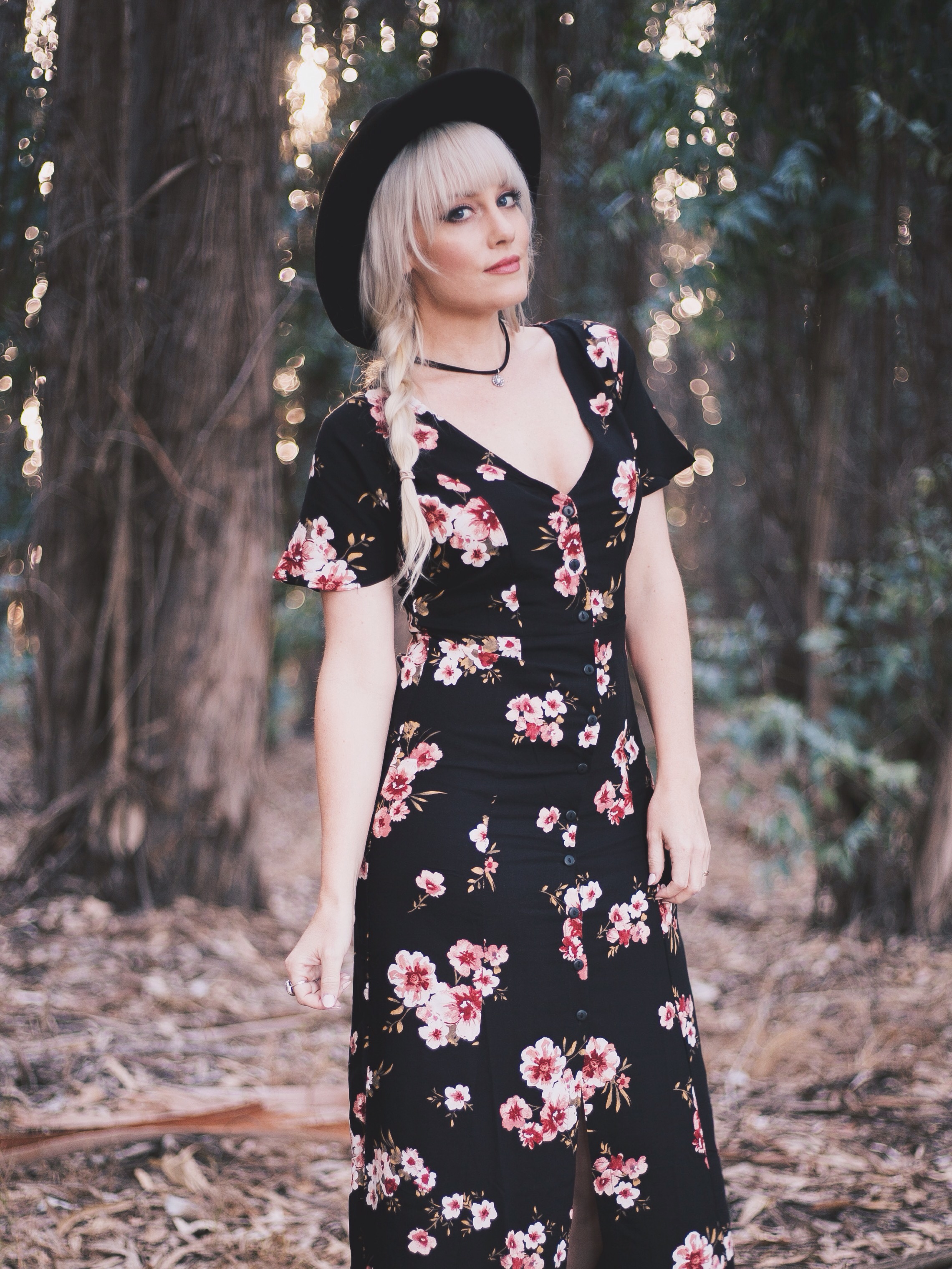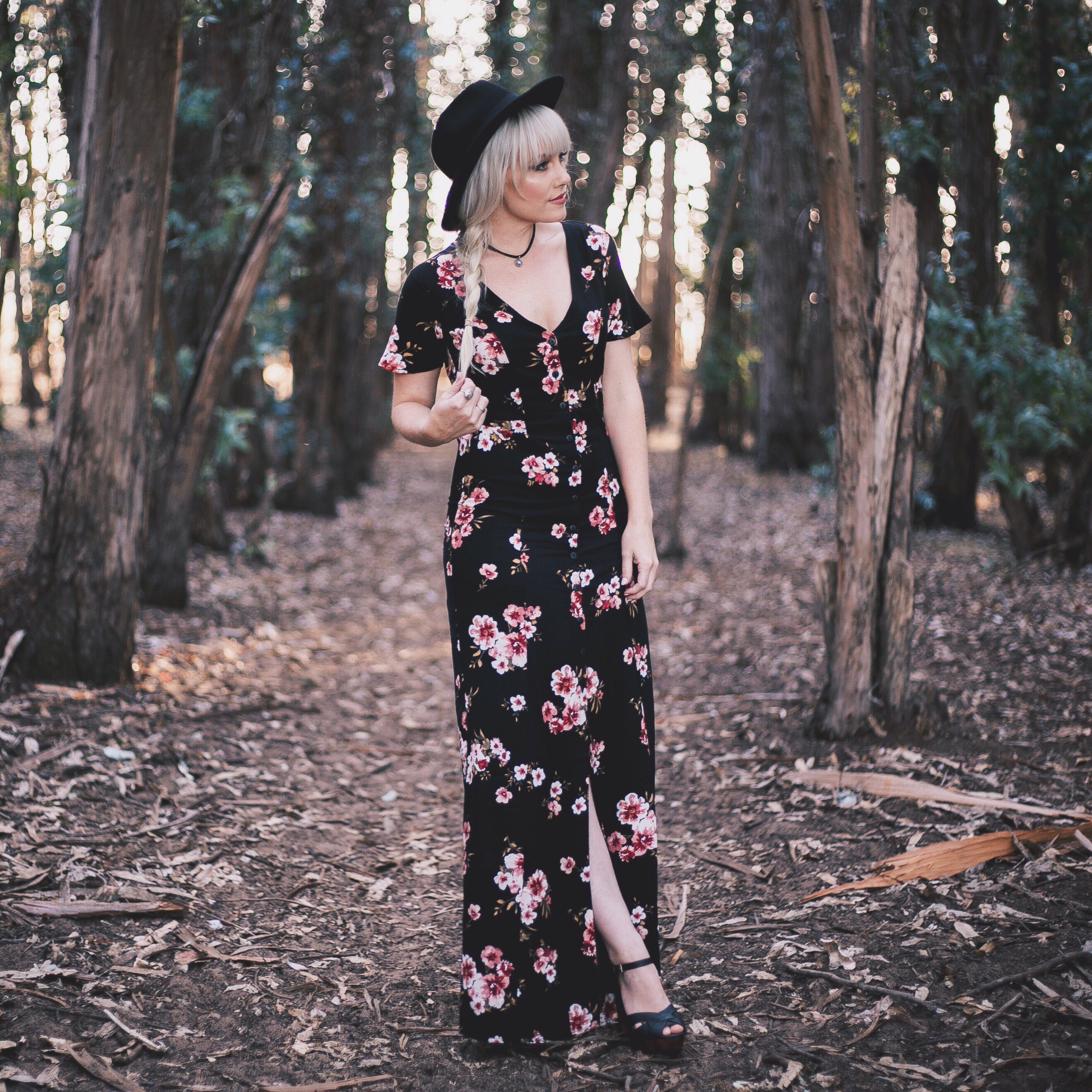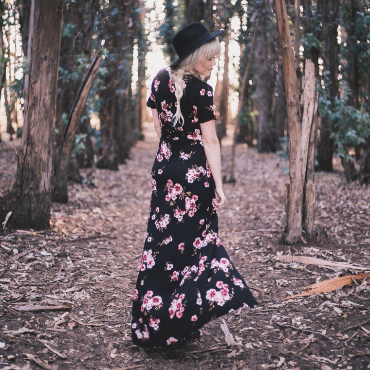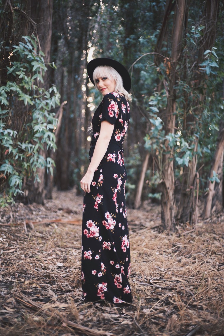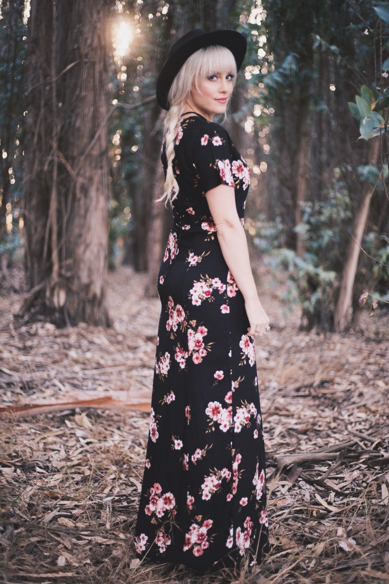I’ve always been a big fan of dark floral patterns, especially for Spring. When I saw this dark floral maxi dress for under $30 at Tillys, I had to have it. I love the buttons down the middle, I love the fit, and I love the corset style lace up detailing in the back. For the last few years, Tillys has been a go-to place for me to shop online. A lot of people think that they just have skater style clothing, but their women’s collection is always spot on with current trends. Not to mention, they always have great deals! This whole outfit is all things Tillys; the choker, the heels, and the dress, and the whole outfit together is under $50. The hat you’ve seen before, it’s my oldie but goodie from H&M, but you can find these pretty much anywhere. I think Tillys might even have one 😉