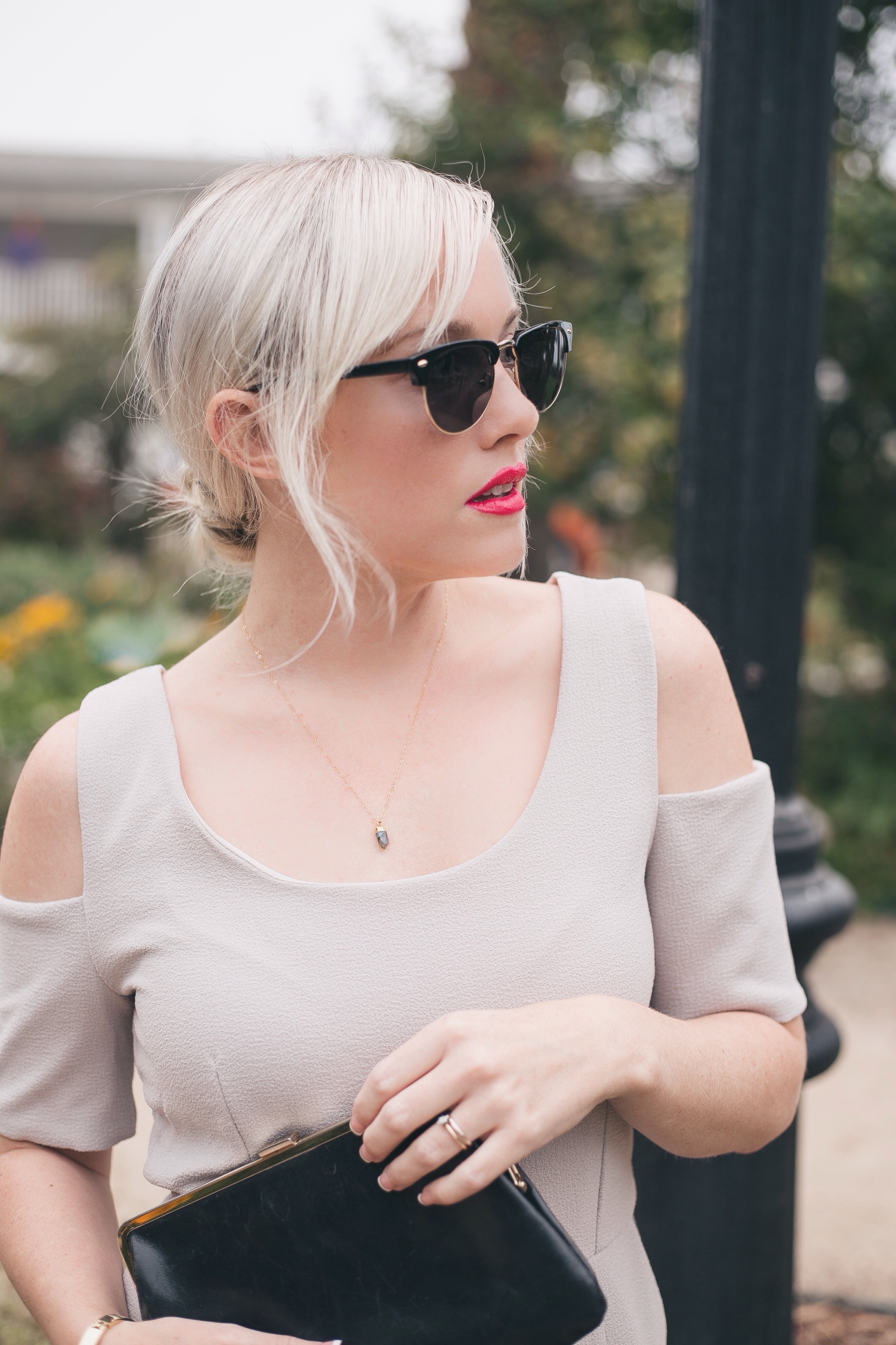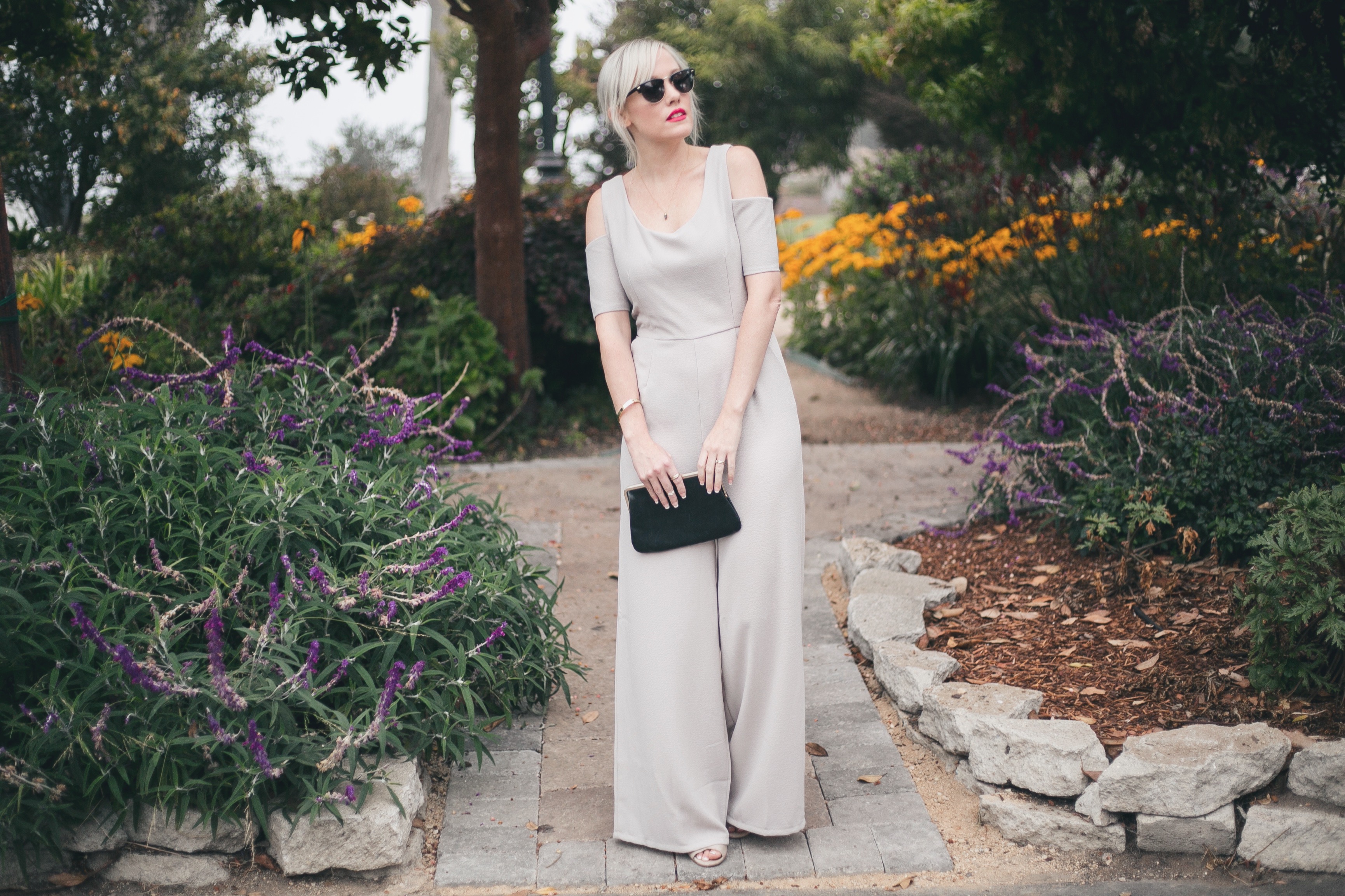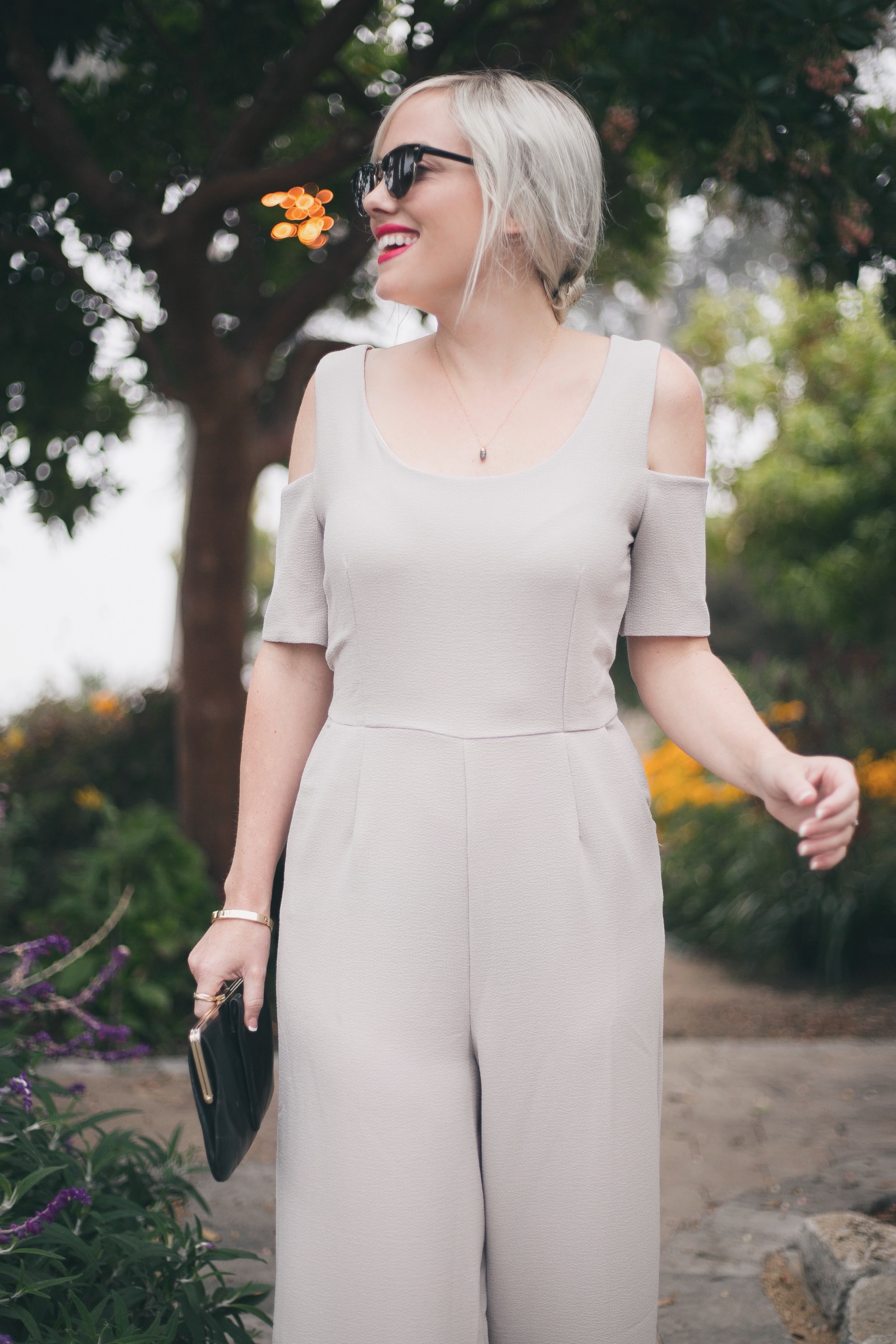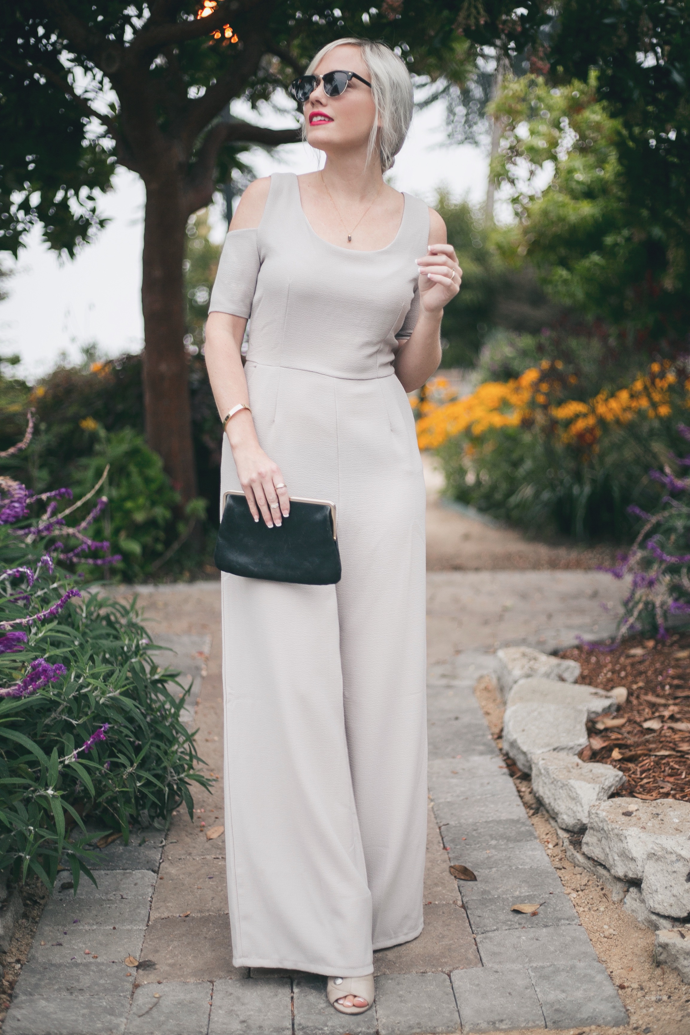 Today’s outfit post is featuring this beautiful gray jumpsuit from WalG London. I came across their Instagram page @walglondon and fell in love with their collection. I had my eye on a couple of their jumpsuits and was so excited that they sent me this one! WalG London is based in London, England but they do have an online shop. Their shop has a good mix of casual to sophisticated looks and I love how how each piece has an effortless elegance to it. I styled my jumpsuit with a gold Baublebar bracelet, some dainty midi rings, my Eyebuydirect sunnies, my new Pueblo Street Jewelry necklace, some gray Vince Camuto wedges, and my vintage Hobo clutch that my sweetie got me several years back. I think this would be the perfect outfit for a wedding, special event, or even a fancy date night 🙂