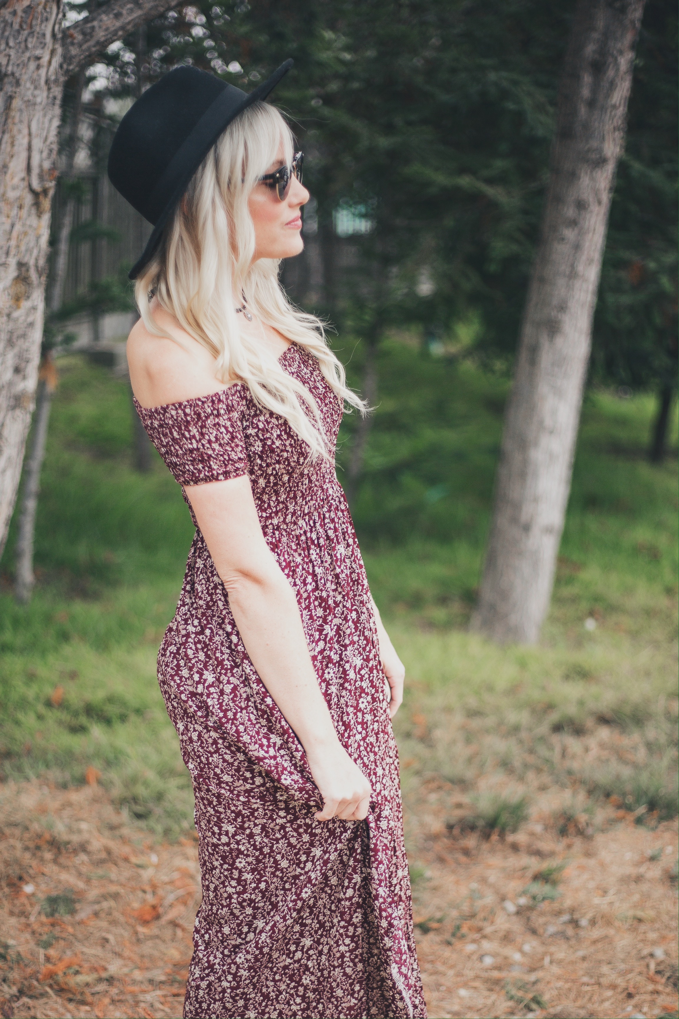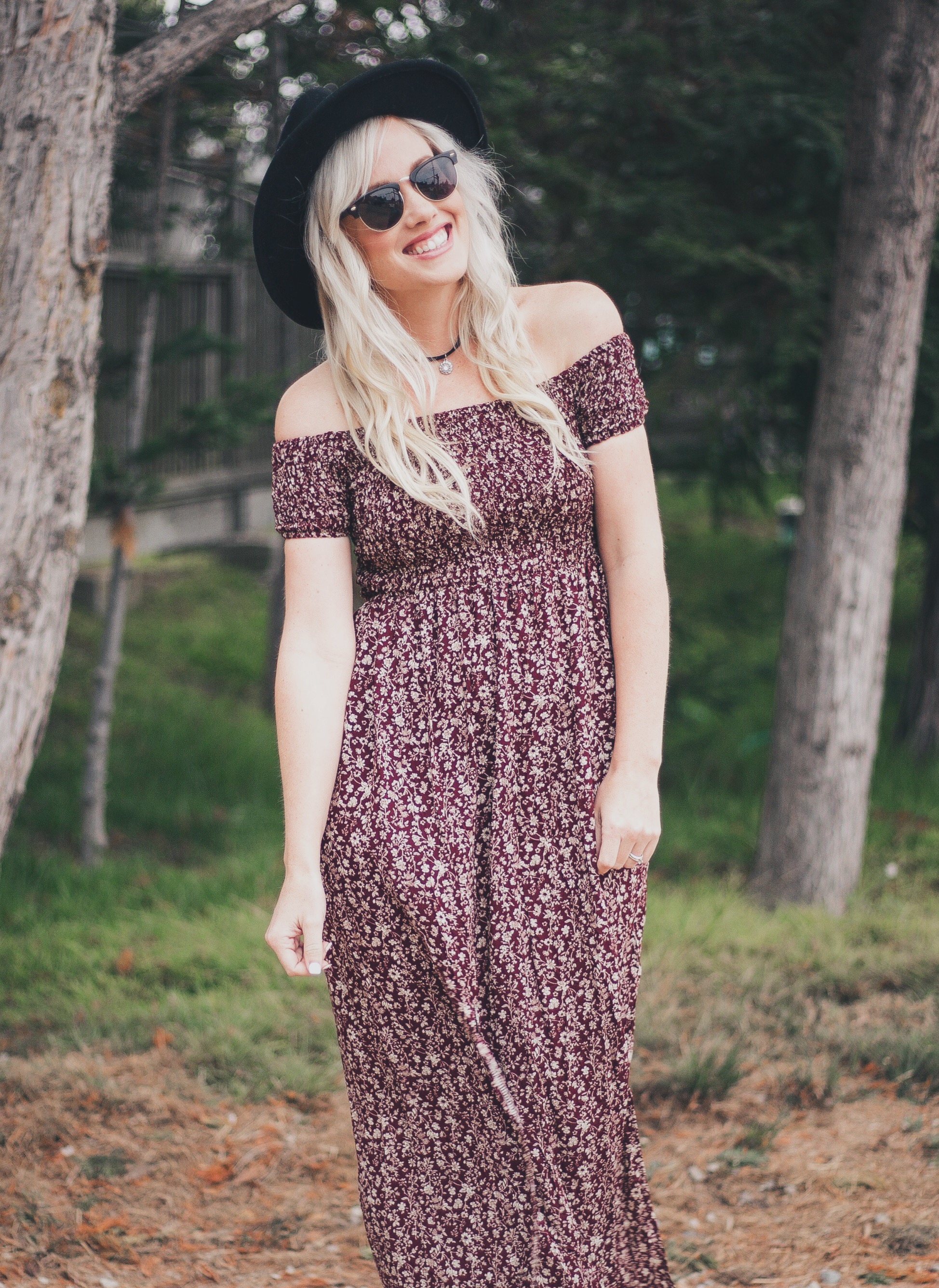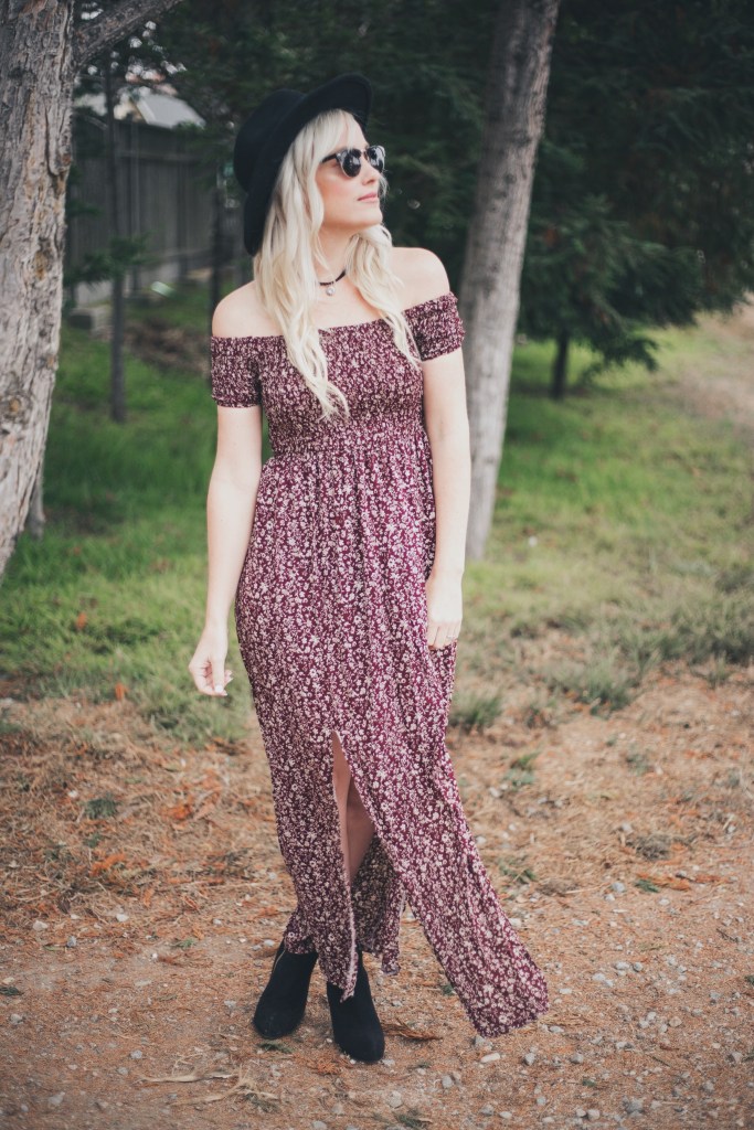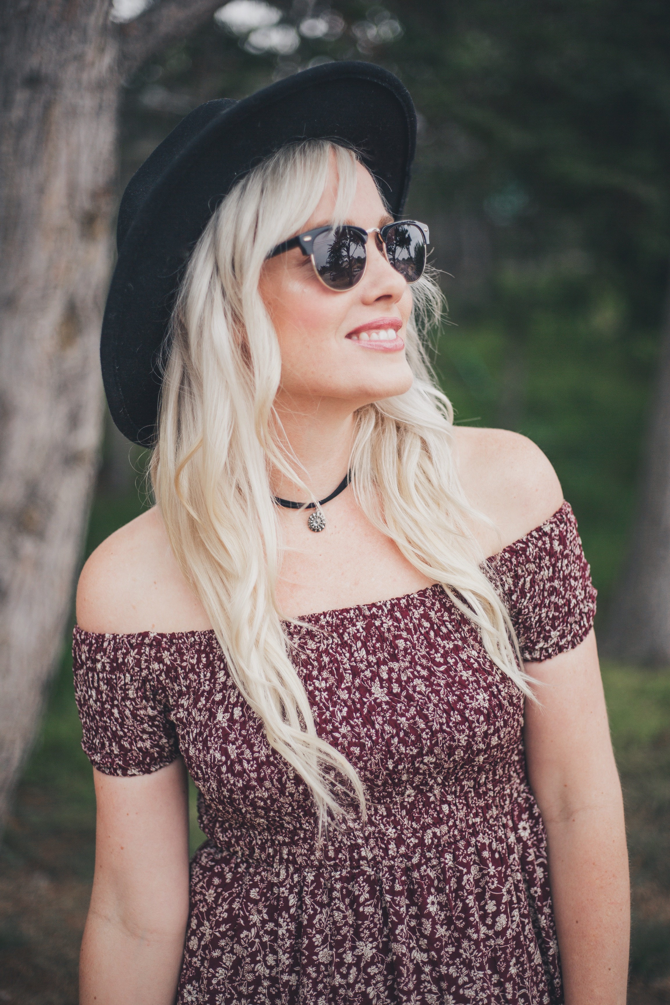 You guys, this dress from Zaful is adorable and it’s only $16.00! I’m loving off the shoulder maxi dresses lately and I think the burgundy color, print, and style of this one is perfect. Here is a direct link to it on Zaful. For size references, I am 5′ 3″ and wearing a size small. Check out their website for really affordable and cute clothes! I styled my dress with my thrifted black booties, old black hat, favorite choker from Tillys, and my prescription sunnies from EyeBuyDirect. I hope everyone is enjoying these last days of Summer!