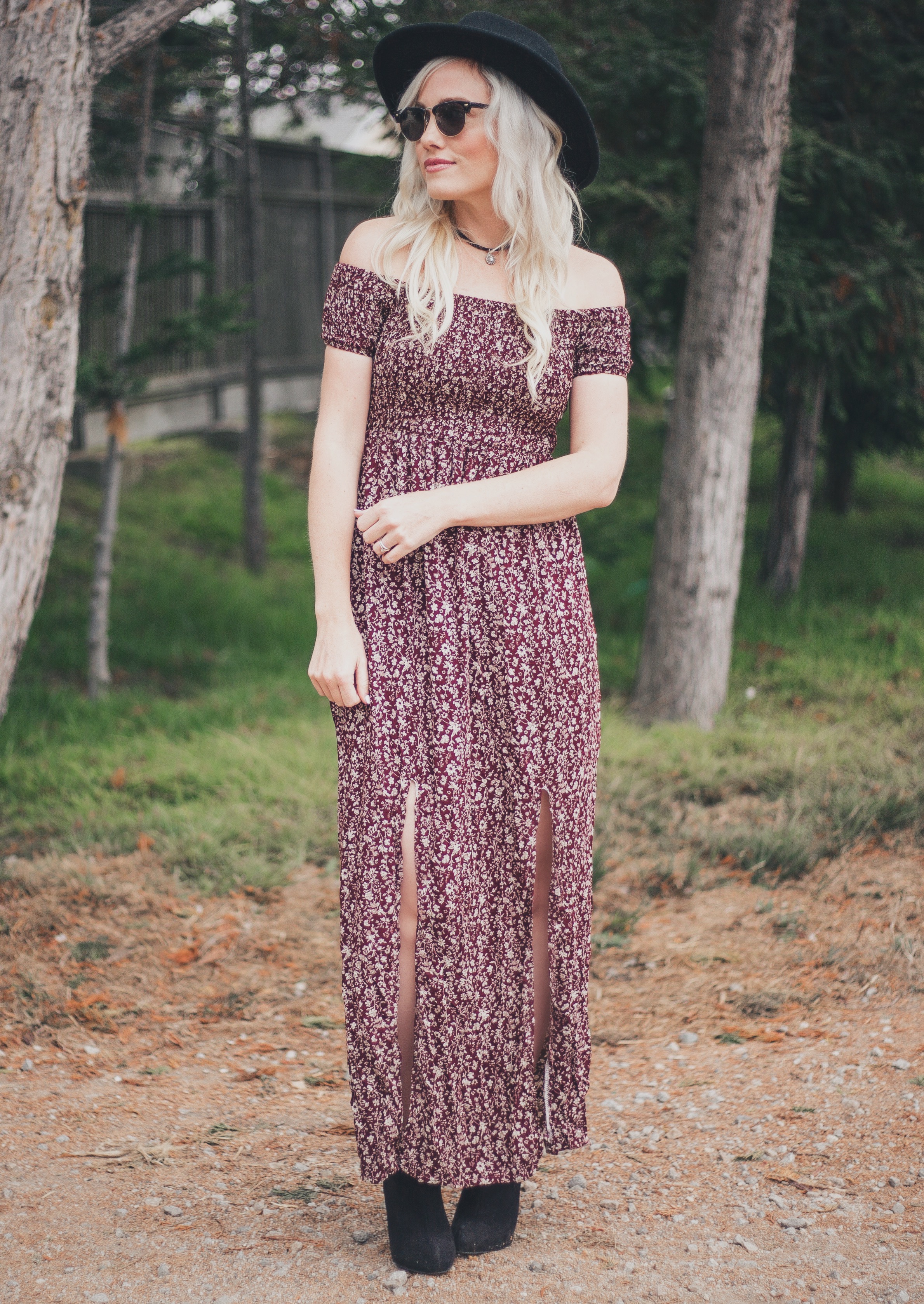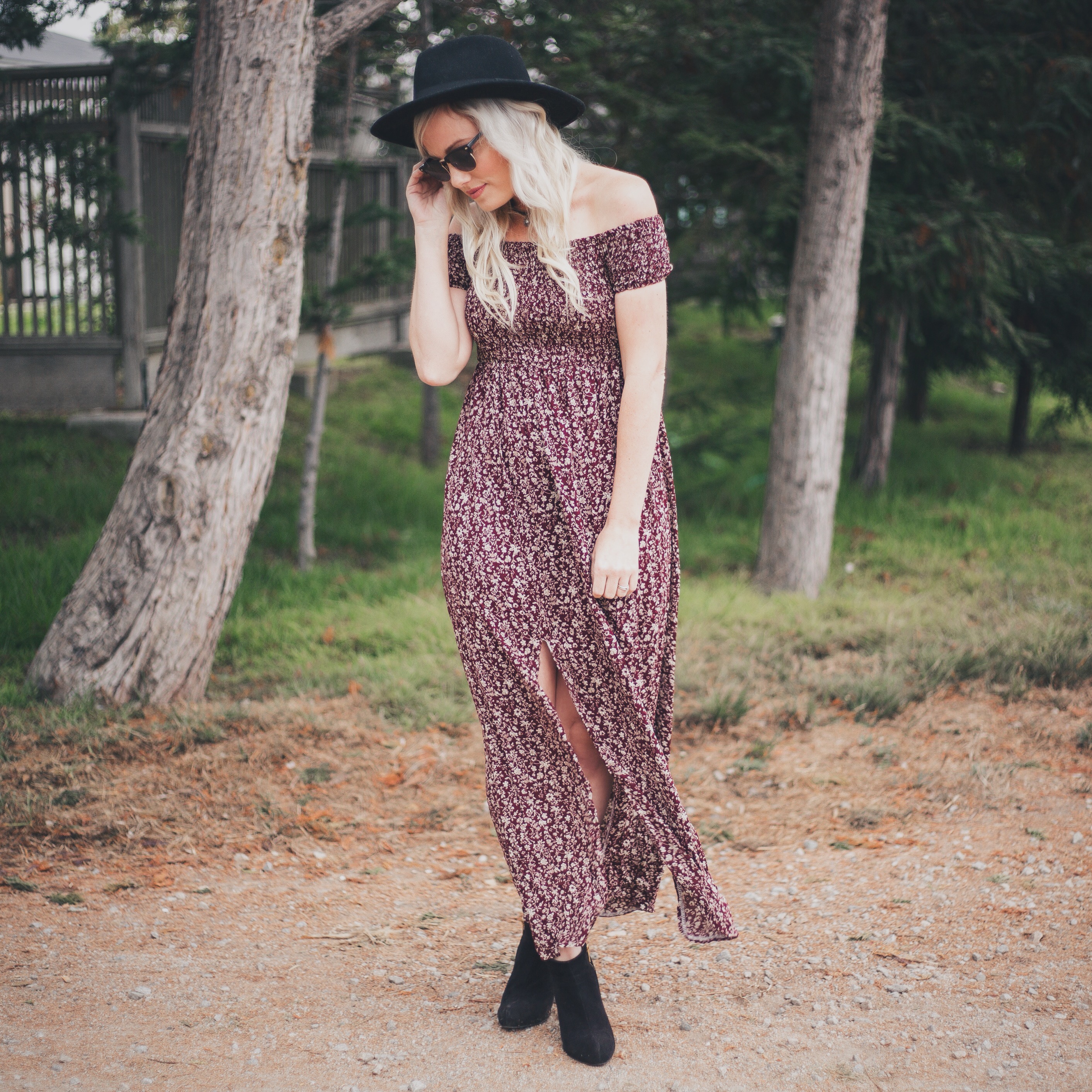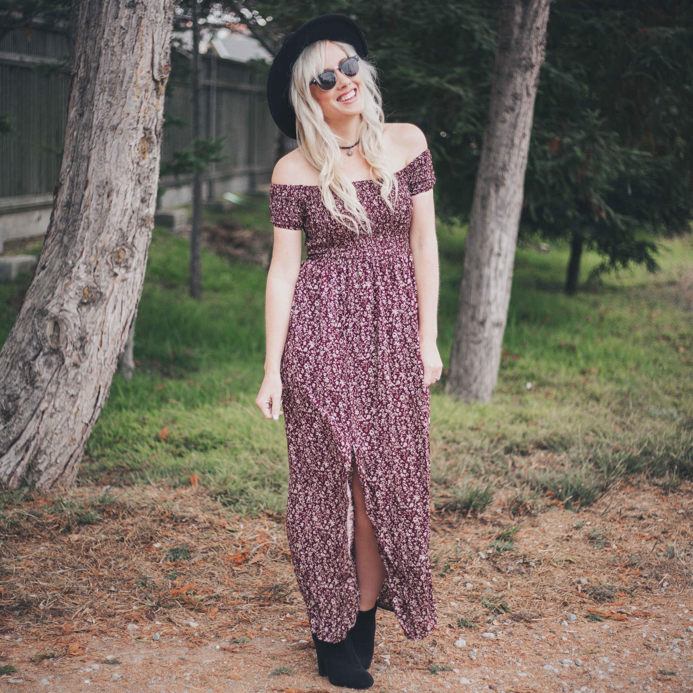 You guys, this dress from Zaful is adorable and it’s only $16.00! I’m loving off the shoulder maxi dresses lately and I think the burgundy color, print, and style of this one is perfect. Here is a direct link to it on Zaful. For size references, I am 5′ 3″ and wearing a size small. Check out their website for really affordable and cute clothes! I styled my dress with my thrifted black booties, old black hat, favorite choker from Tillys, and my prescription sunnies from EyeBuyDirect. I hope everyone is enjoying these last days of Summer!