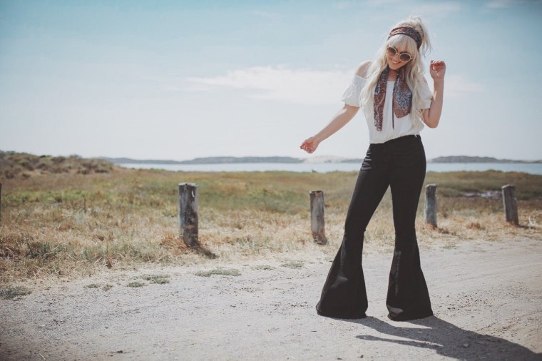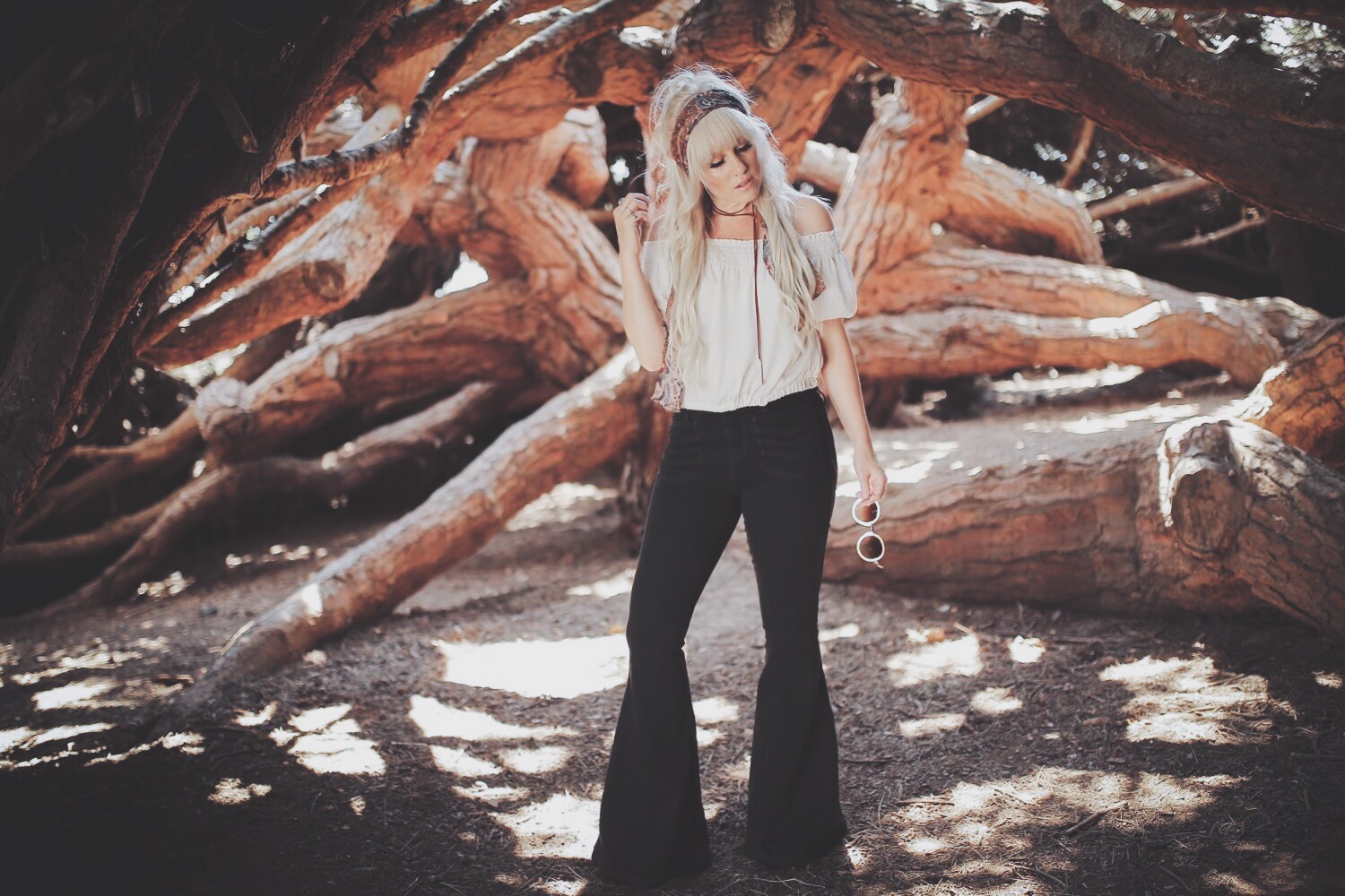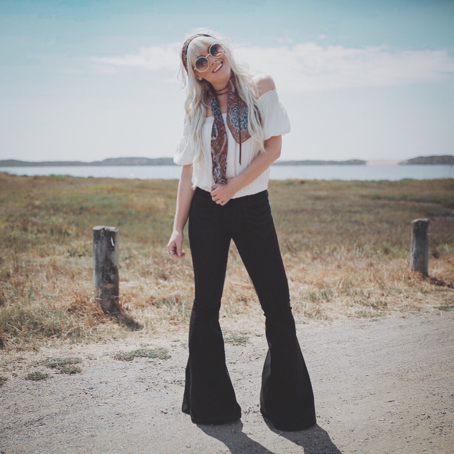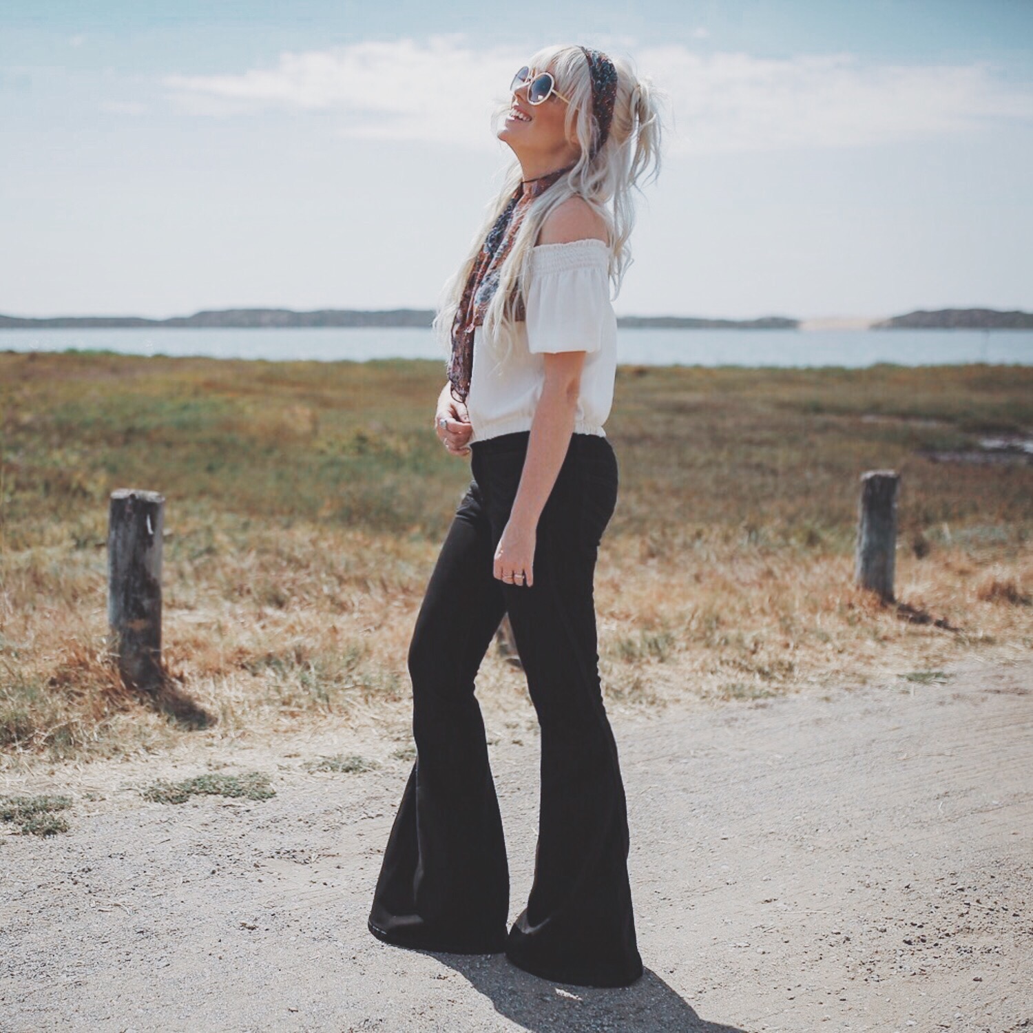 In the process of cleaning out my closet I came across some Free People jeans that I had in my drawer that I got last year and totally forgot about. I’ve always been inspired by fashion from the 70s. I love looking though my moms old photos and gaining inspiration from her cute style (see October 2016 in my archives) In the process of finding my pair of Dittos last year, I found these black Free People bell bottoms. It was hard to find bells that had a wider flare at the bottom, so I was stoked to find these. Plus they were 50% off the regular price, so that’s always a win. They are styled with a white off the shoulder top and bolo tie from Forever 21, and my new head scarf that I thrifted for $1. Where do you get your fashion inspiration from?