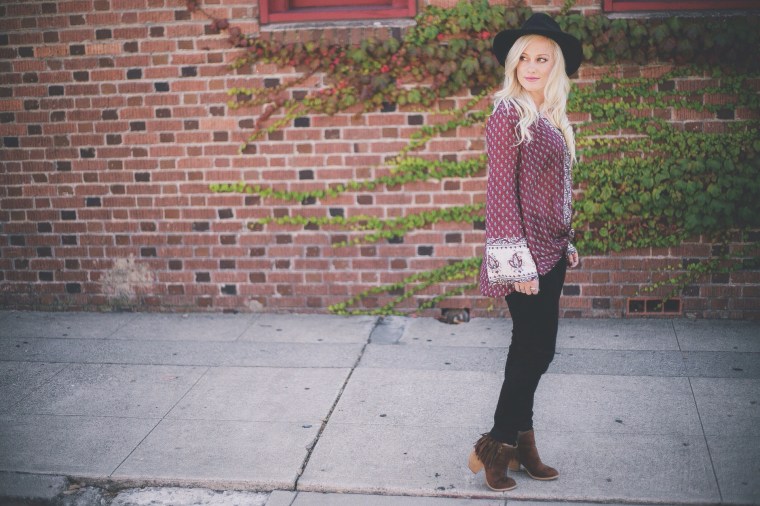 I received the cutest boots recently from a company called Not Rated Footwear. I’m such a fan of fringe boots! I was just about to re-sole another pair I had, then these showed up on my doorstep. I love the color, the size of the heel, the zipper detailing, and how the fringe wraps around the back of the heel. I totally recommend checking out their collection and if you see a pair you have to have, use the code “KARI JANE” at check out and you can receive 20% off your purchase! The name of the boots I am wearing are called “Flipping Fringe.” My peasant top is made by Billabong and my husband got it for me for Christmas last year from Tillys. They have a lot of peasant style tops and dresses right now that I definitely recommend checking out! I was in a Hot Topic store recently shopping for gifts for my sister and randomly decided to try on their jeans. I was pleasantly surprised with how well they fit! These black ones are their “super skinny” style and they’ve definitely become my new favorite jeans. My hat is an old one from H&M but you can find similar ones for an affordable rate at Forever 21. Have fun and be inspired today! Always remember that you are beautiful, loved, and you are enough!