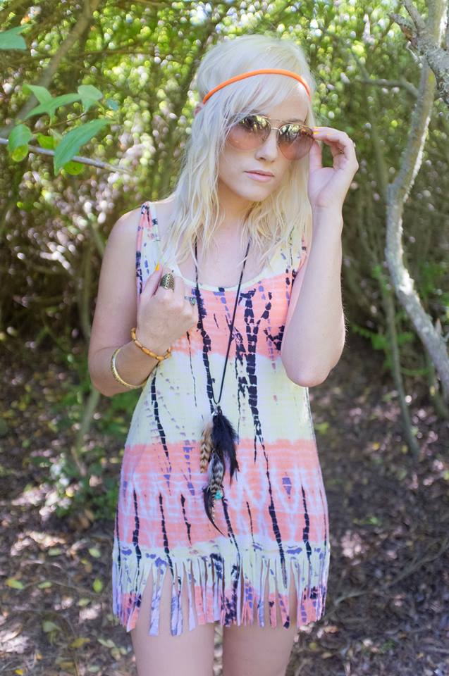 This summer it’s all about bold and bright colors. Make a statement with an electric orange headband, a native feather necklace, aviator sunglasses, vibrant nail polish, bracelets, rings, and a fringed summer dress! This whole outfit I found at Forever 21 for under $20. The electric orange headband was made from an old neon t-shirt I had. I simply cut the hem off of one of the sleeves and turned it into a headband. Have fun with your wardrobe this summer and try a pop of color to your look!